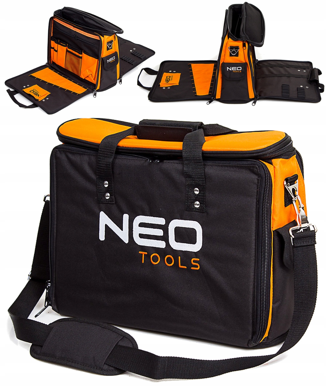Збірна сумка NEO (ref. 84-308) виготовлена з поліестеру 600 D, що забезпечує довговічність сумки. Має жорстке дно з підставками для захисту вмісту при роботі в складних умовах. Сумка оснащена міцною ручкою і ременем для перенесення. Його перевагою є велика кількість кишень - 2 зовнішніх і 17 внутрішніх. У багатьох випадках призначені для ручних інструментів, щоб полегшити їх зберігання та транспортування. 3 основні відділення дозволяють безпечно переносити інструменти та документи.
