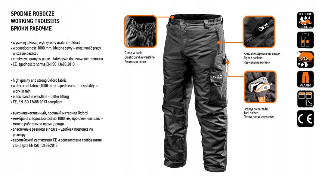 - Робочі утеплені штани NEO високої якості , міцний матеріал 300D Oxford, утеплений легким поліестером, який забезпечить комфорт у морозні дні.