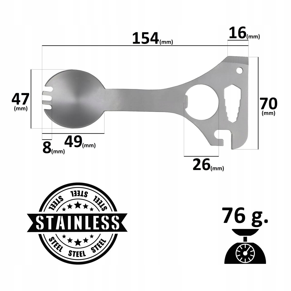 Залежно від ваших потреб, його можна використовувати як: виделку, ложку, відкривач для пляшок, консервний нож, плоску викрутку або гайковий ключ