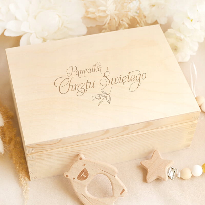 - Дерев'яний ящик - предмет першої необхідності для дитини. На кришці нанесено гравіювання «Сувенір «Святе Хрещення».