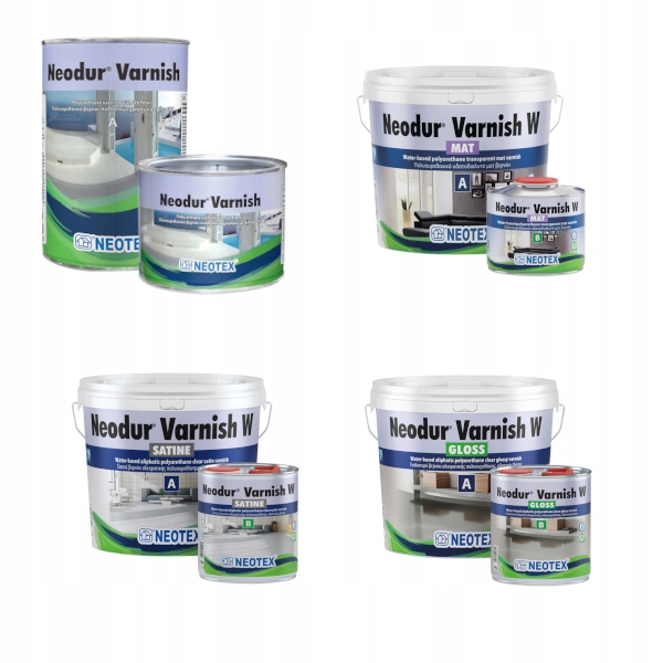 - NEODUR VARNISH W - лак для захисту смоляних, бетонних, мікроцементних і цегляних підлог. Стійкий до УФ-випромінювання - не жовтіє. Випускається в трьох варіантах покриття: Mat (матовий), Satine (сатин) і Gloss (глянець). Продукт без розчинників.