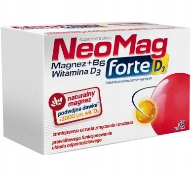 Дієтична добавка NeoMag forte D3 містить натуральний магній і доданий вітамін D. Також містить вітамін B6. Вітамін B6 і магній сприяють належному функціонуванню нервової системи, вони також забезпечують підтримку належних психологічних функцій і допомагають зменшити відчуття втоми та втоми.