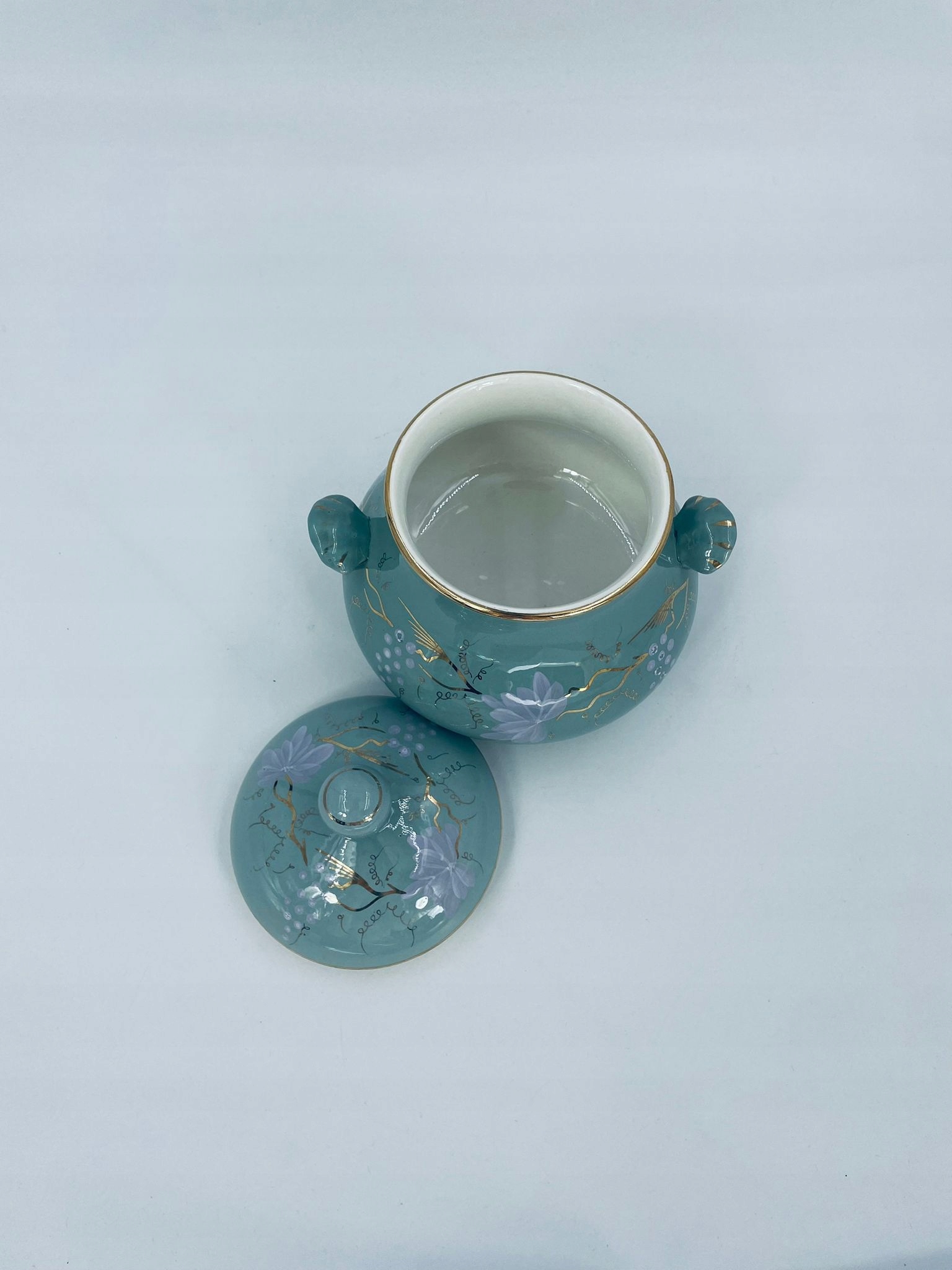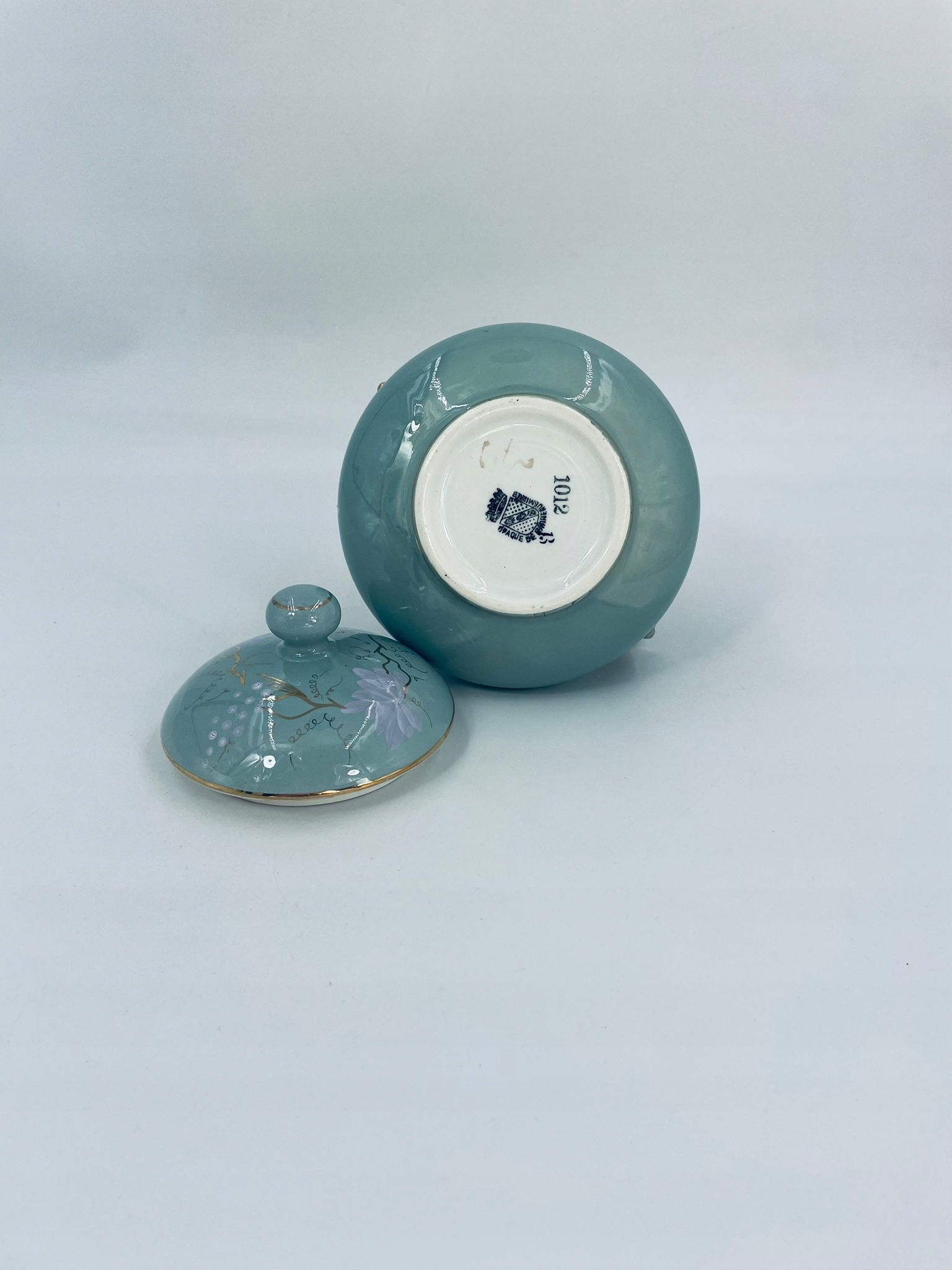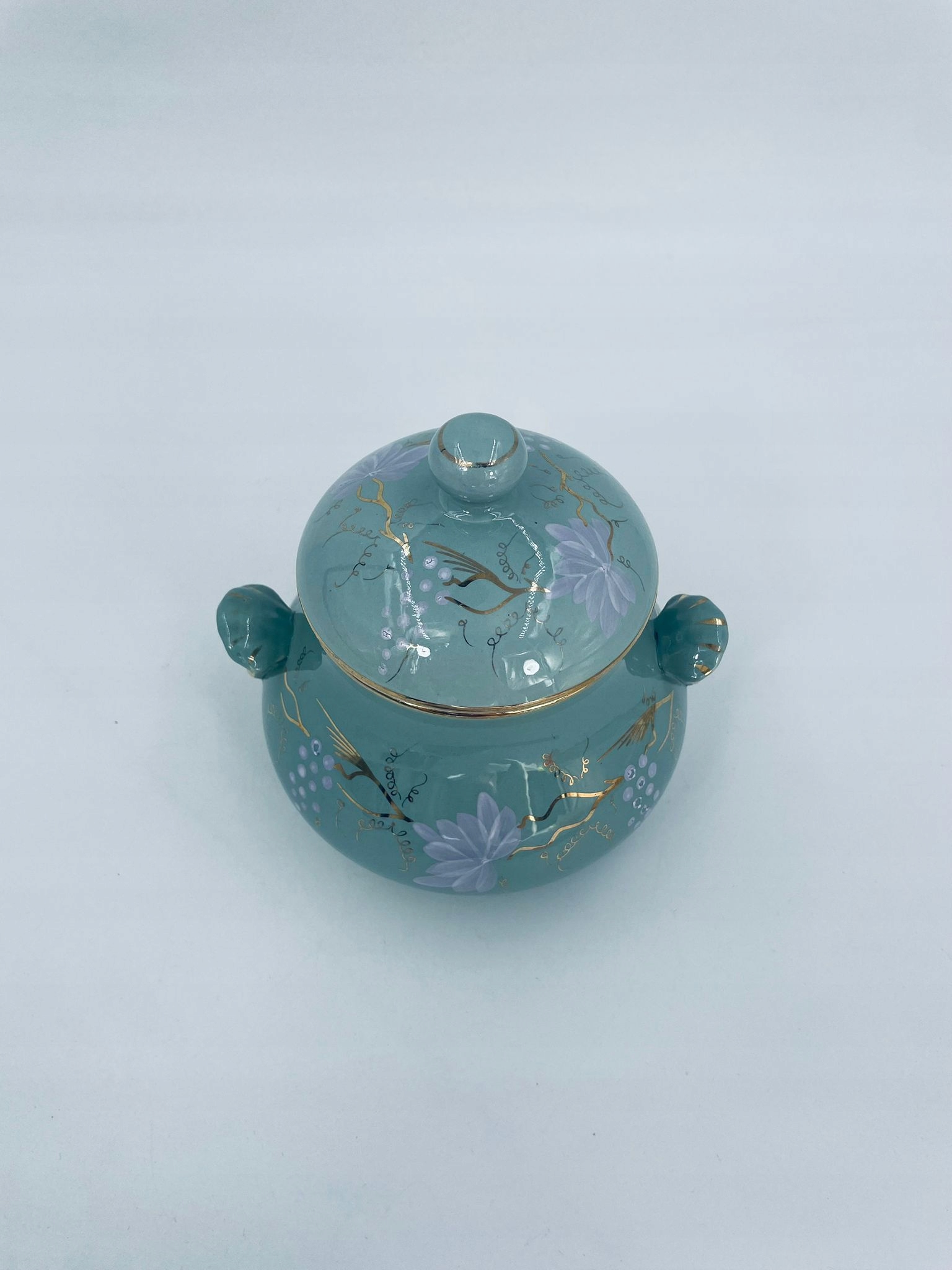 Непрозора цукерниця/цукерниця de Sarreguemines, виготовлена з бірюзової майоліки. Об’єкт із двома декоративними ручками та кришкою з ручним розписом виноградної лози, оздоблений золотими вставками. Має тріщину біля ручок.