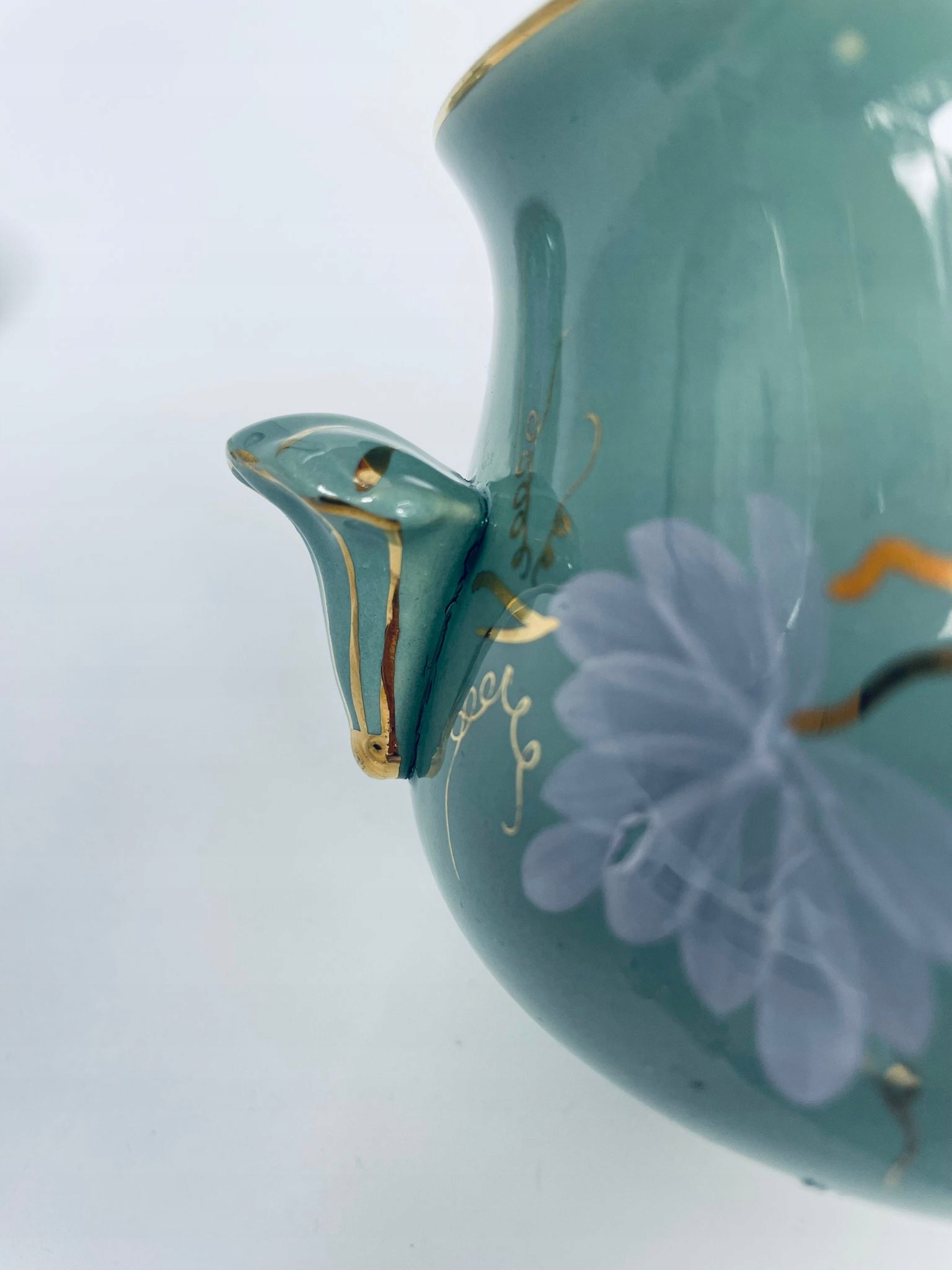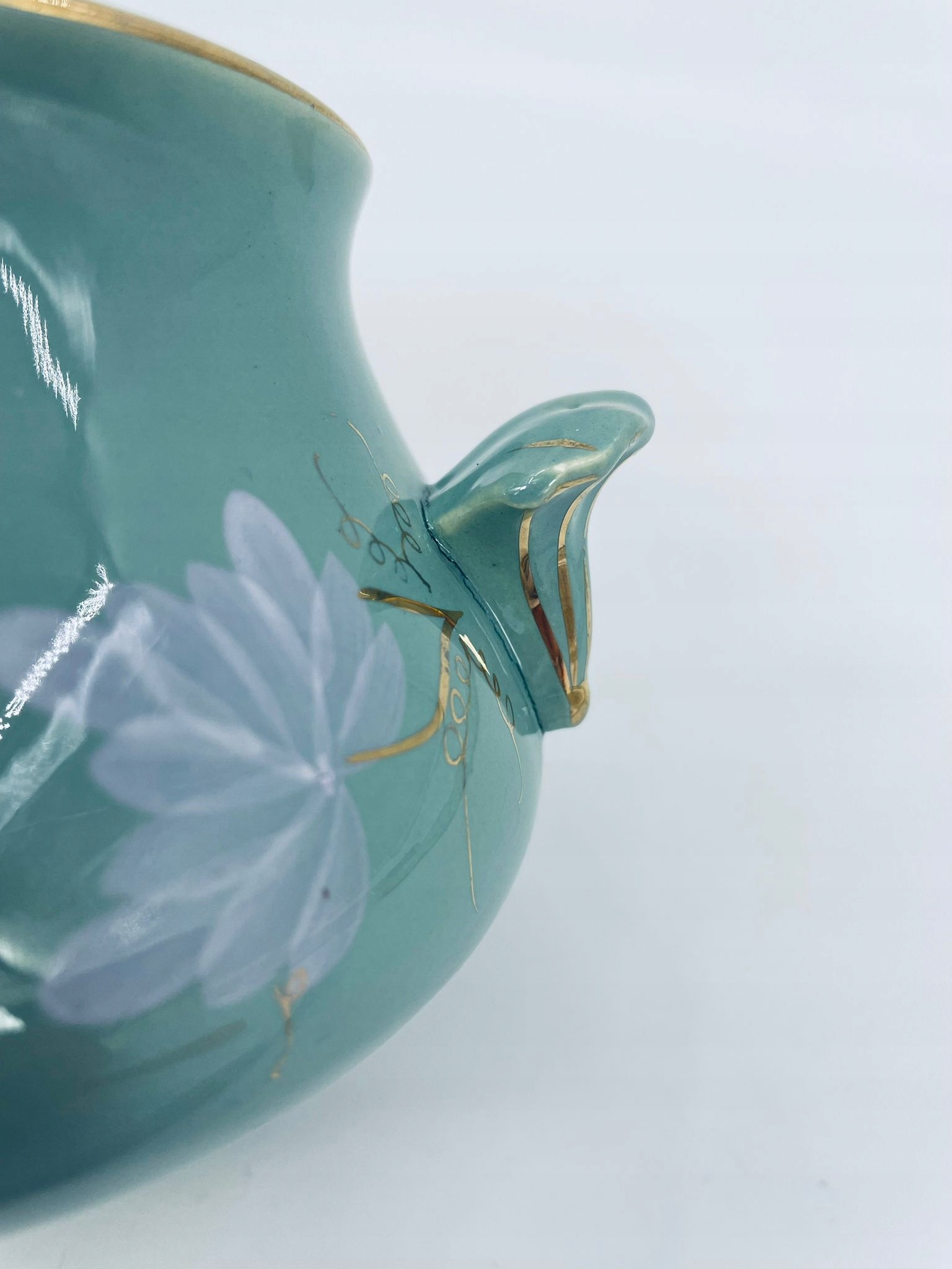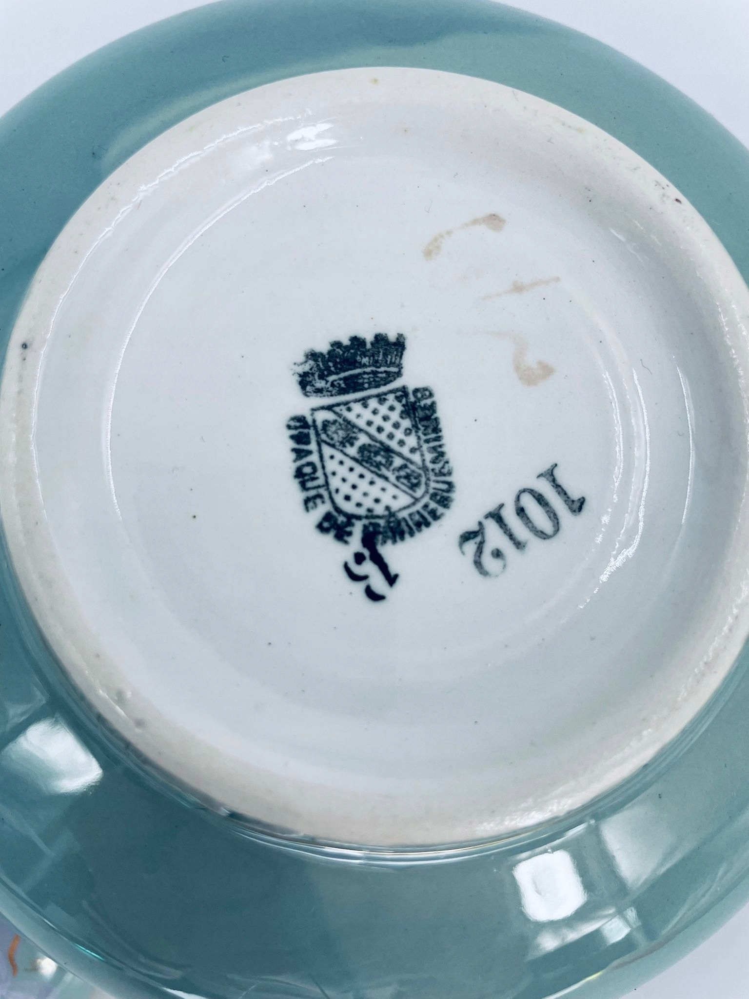 Непрозора цукерниця/цукерниця de Sarreguemines, виготовлена з бірюзової майоліки. Об’єкт із двома декоративними ручками та кришкою з ручним розписом виноградної лози, оздоблений золотими вставками. Має тріщину біля ручок.