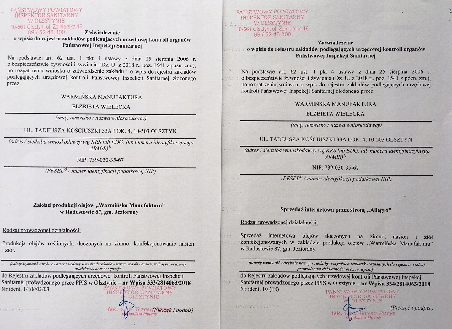 Заради вашої безпеки та найвищої якості наших продуктів, Warmińska Manufaktura, відповідно до чинного Закону про безпечність харчових продуктів і харчування (Закон від 25 серпня 2006 р., Законодавчий журнал 2018 р., поз. 1541), введено в журналі обліку рослин, що підлягають контролю Держсанепіднагляду.