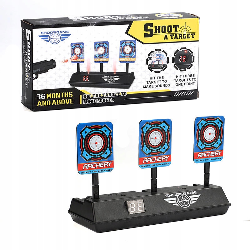 Перевірте свою влучність! Тепер в комплекті з лаунчером ви отримаєте мішень Electronic Nerf, яка підраховує бали. Щит складається з основи і трьох рухомих цілей. Кожна ціль при попаданні падає назад. Збивши три мішені, ми отримуємо одне очко, і всі мішені автоматично піднімаються. Щит має світлові та звукові ефекти. Зберіть друзів, завантажте пускові установки та перевірте свою точність!