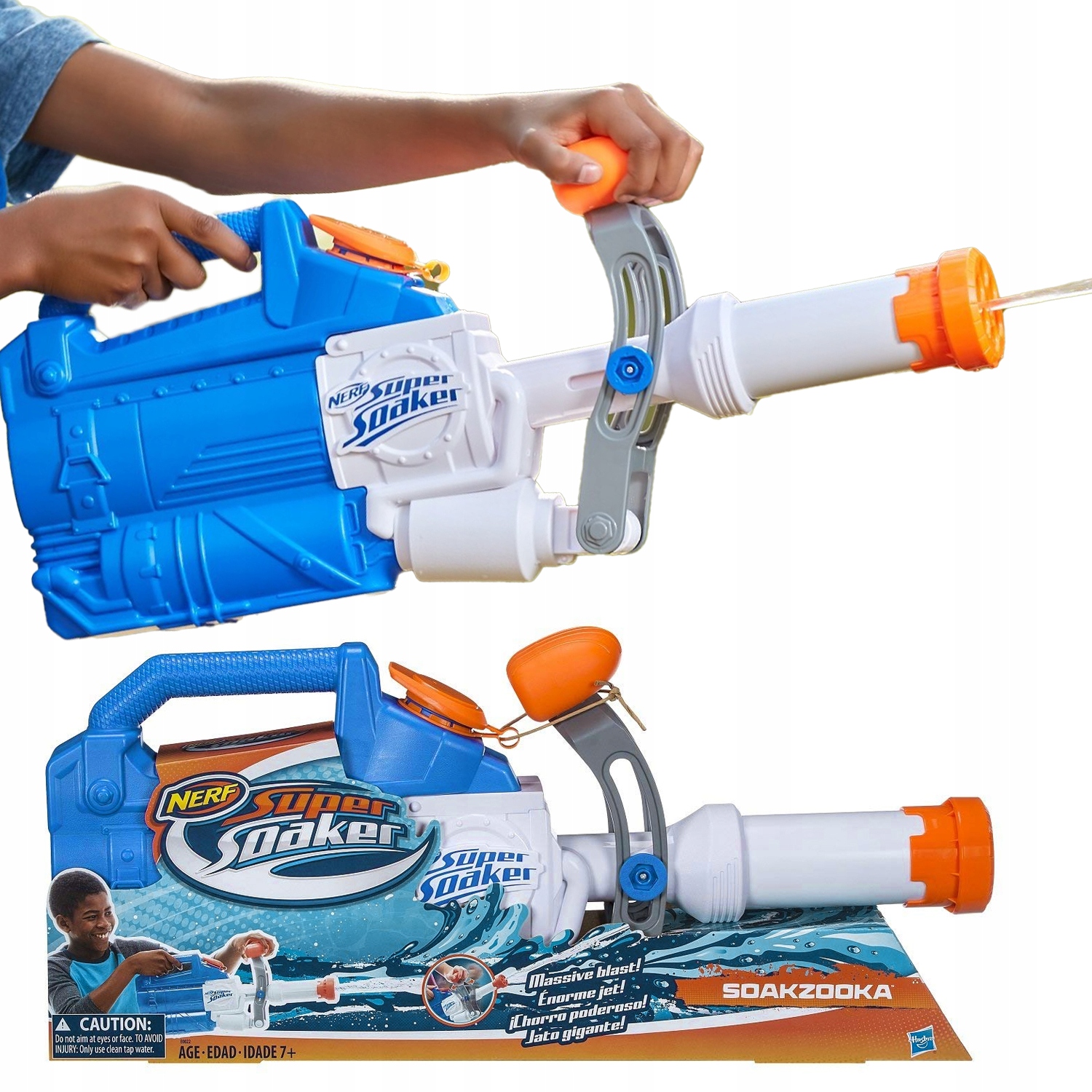 Soakzooka — єдина водна базука Nerf! Виходьте на вулицю та беріть участь у водному бою за допомогою бластерів Nerf Super Soaker. З цією потужною зброєю, коли прийде час, ви зможете просочити суперника з ніг до голови величезним потоком води! Вам не доведеться хвилюватися про те, що закінчаться боєприпаси, оскільки пускова установка має великий бак для води об’ємом 1,6 л. Після бою заповнити магазин можна простим способом - відкривши помаранчеву кришку і виливши воду через отвір. Щоб постріляти з пускової установки, однією рукою тримайтеся за синю рукоятку, а іншою рухайте ствол вперед-назад, випускаючи струмінь холодної води. Добре прицільтесь, щоб намочити супротивника!