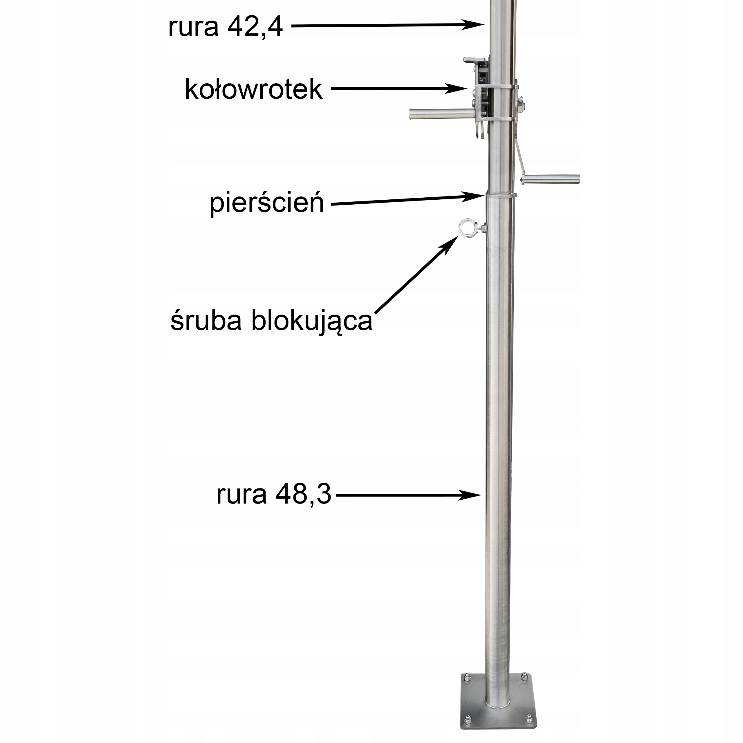 Пропозиція застосовується до високоякісної нержавіючої крана з основою, звареною до труби, що дозволяє гвинтувати гвинти на підлогу або бетонну пластину. У запропонованому наборі ми включаємо високоякісну котушку, кабель з ланцюгами та двома решітками.