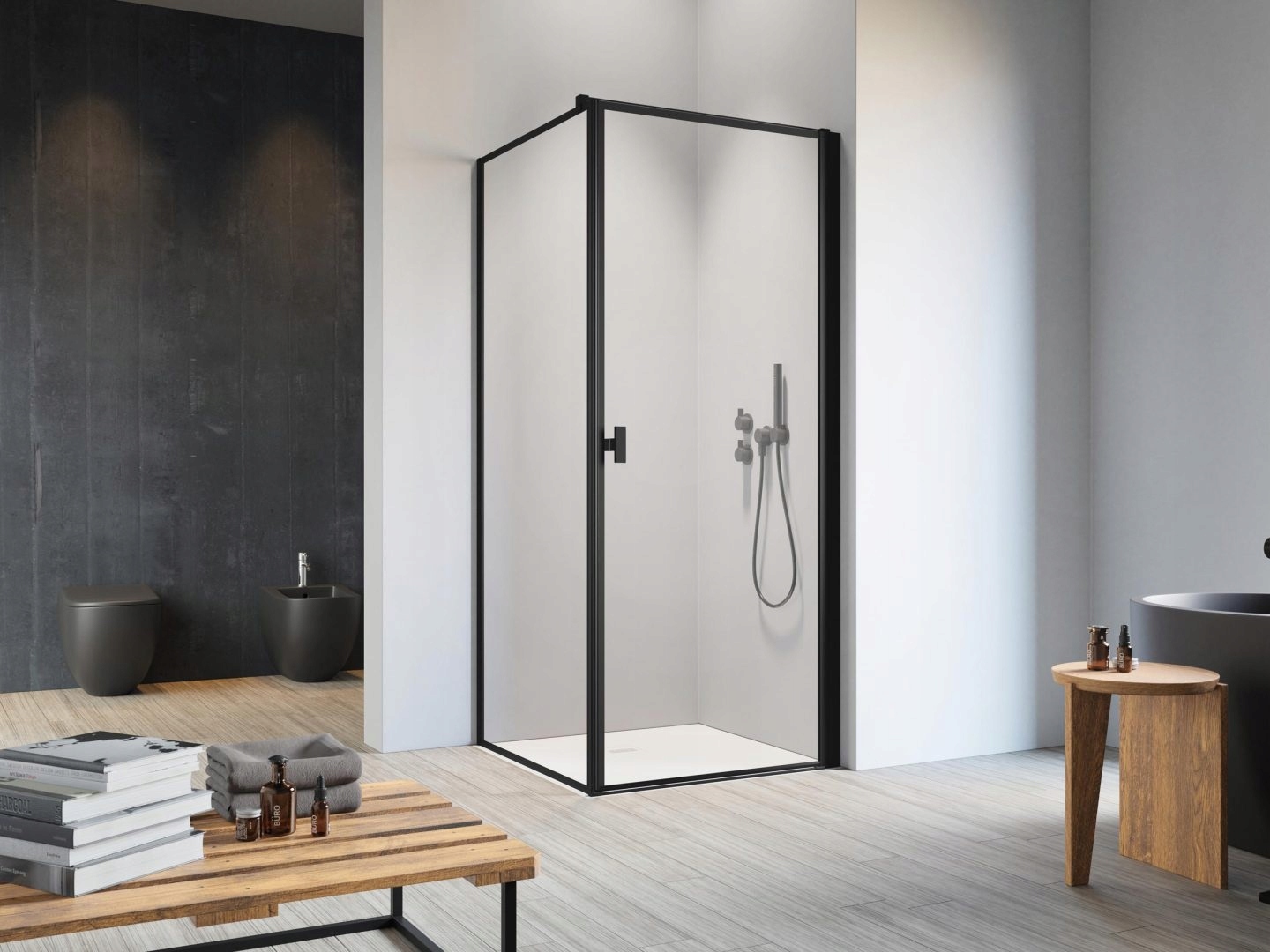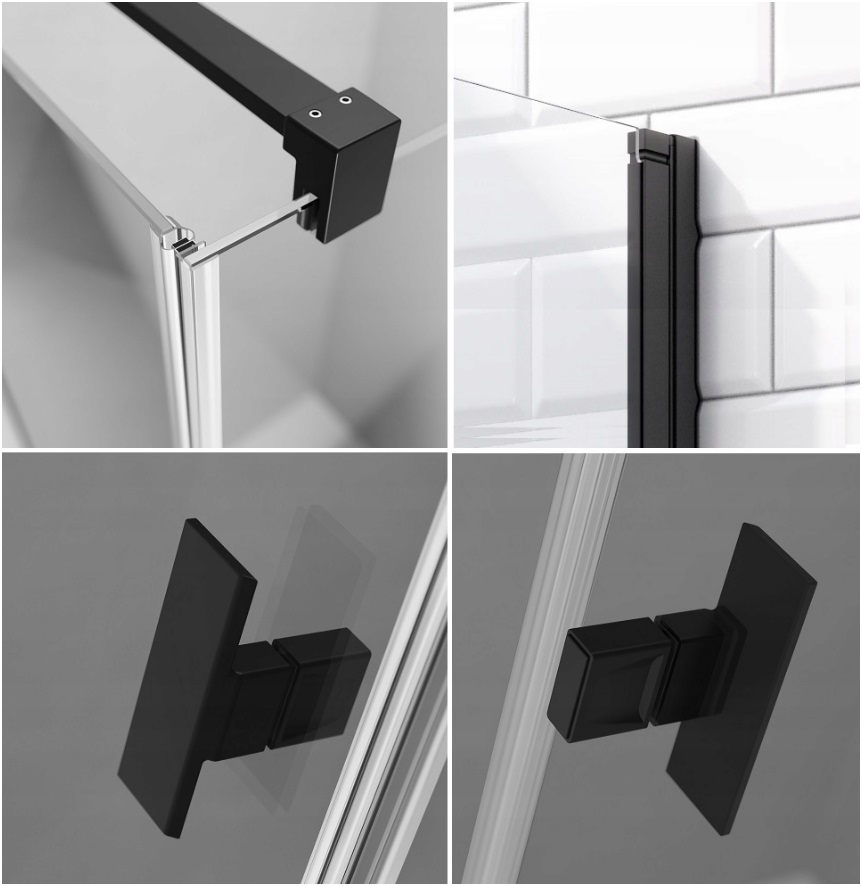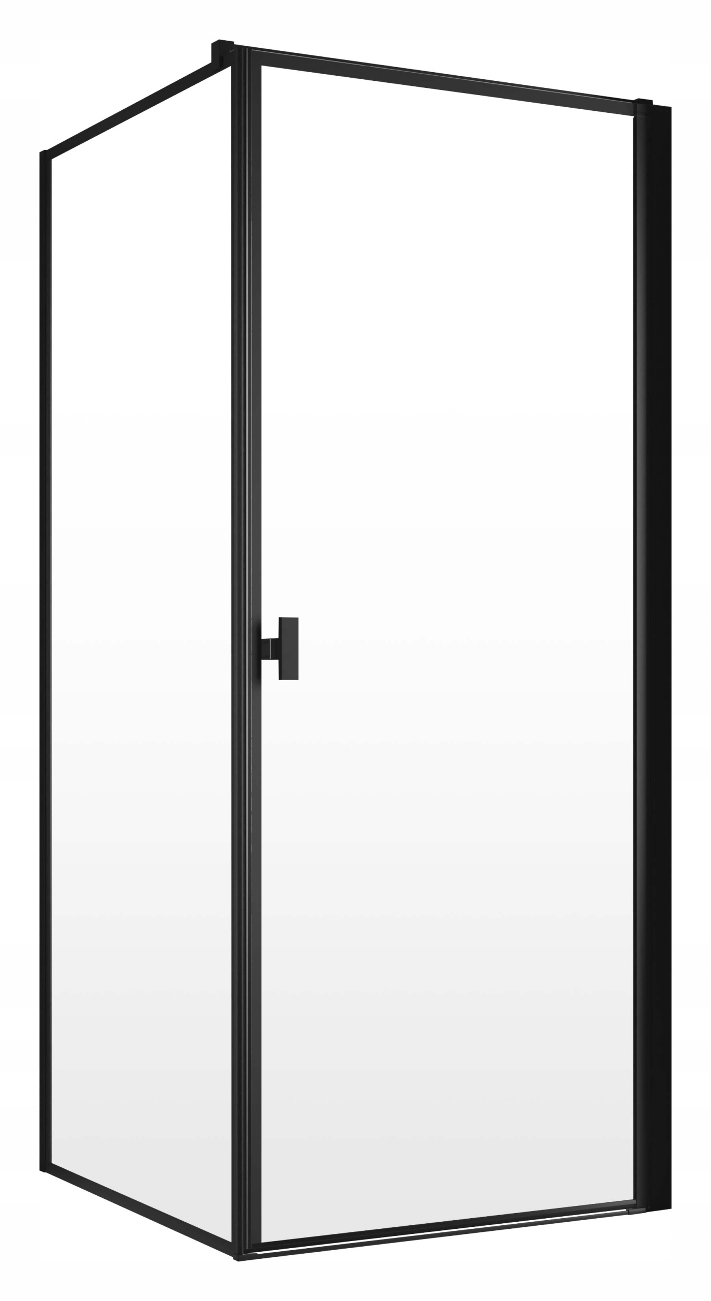 Предметом продажу є душова кабіна NES BLACK KDJ I Frame в правому варіантіз прозорого скла з чорними профілями, без піддону. Перший розмір, наведений над фотографією кабіни, стосується дверей (спереду), а другий розмір стосується нерухомої бічної стінки.