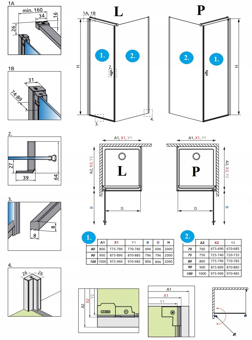 2. Без душового піддону, із збереженням зовнішніх розмірів кабіни - розміри X1 і X2 є розмірами до зовнішнього краю профілю.