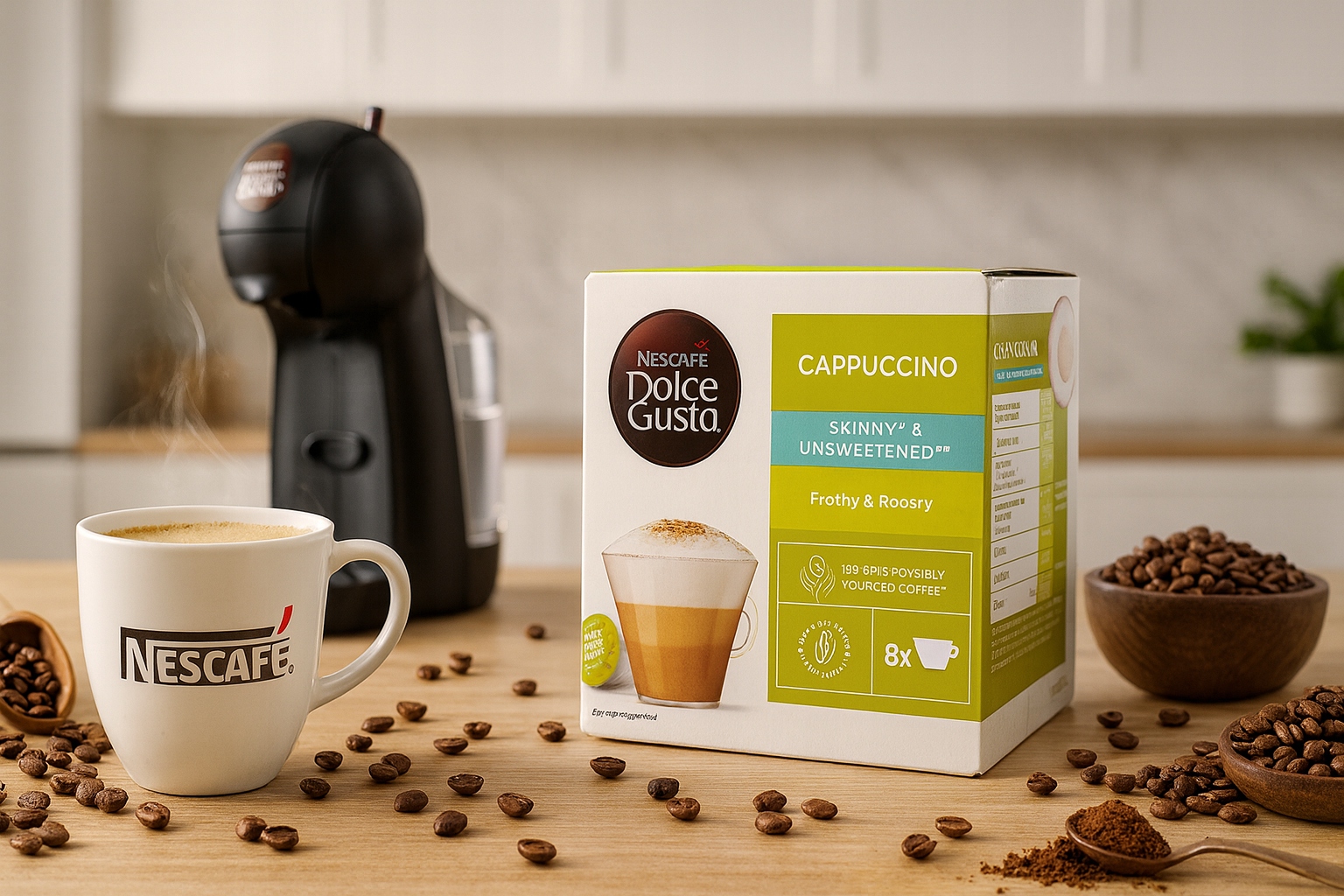 Nescafé Dolce Gusto Cappuccino Skinny & Unsweetened — це пропозиція для людей, які люблять італійське капучіно, але хочуть насолоджуватися ним у більш легкій і здоровій версії — без додавання цукру. Кожна порція - це ідеальне поєднання інтенсивного 100% еспресо Arabica з ніжною молочною піною кремової консистенції.