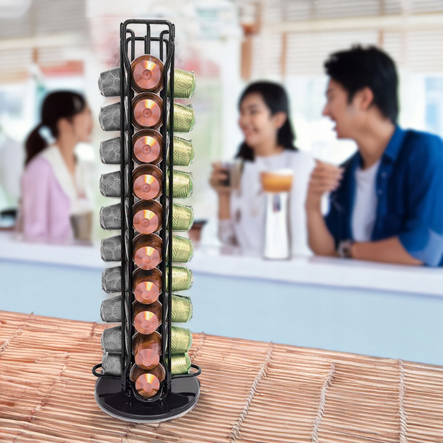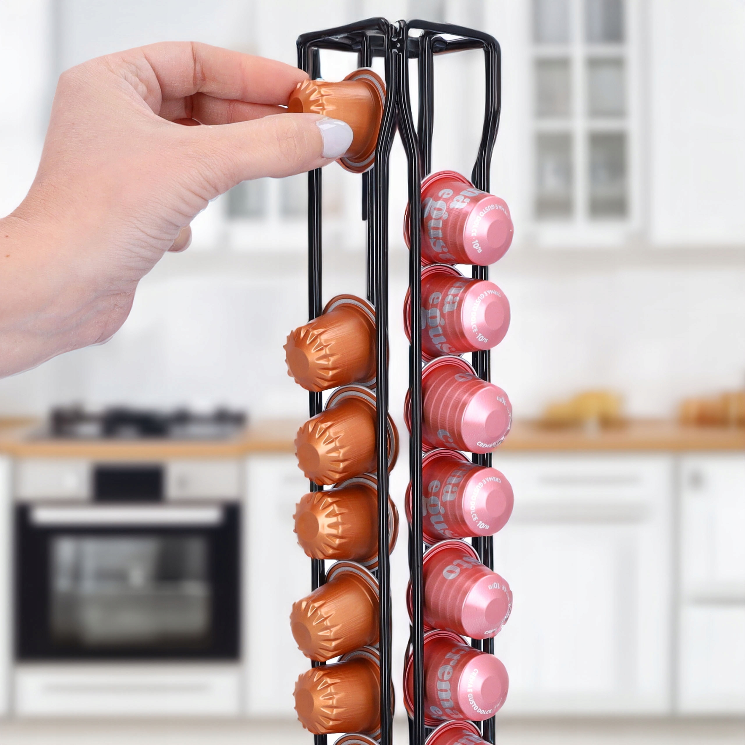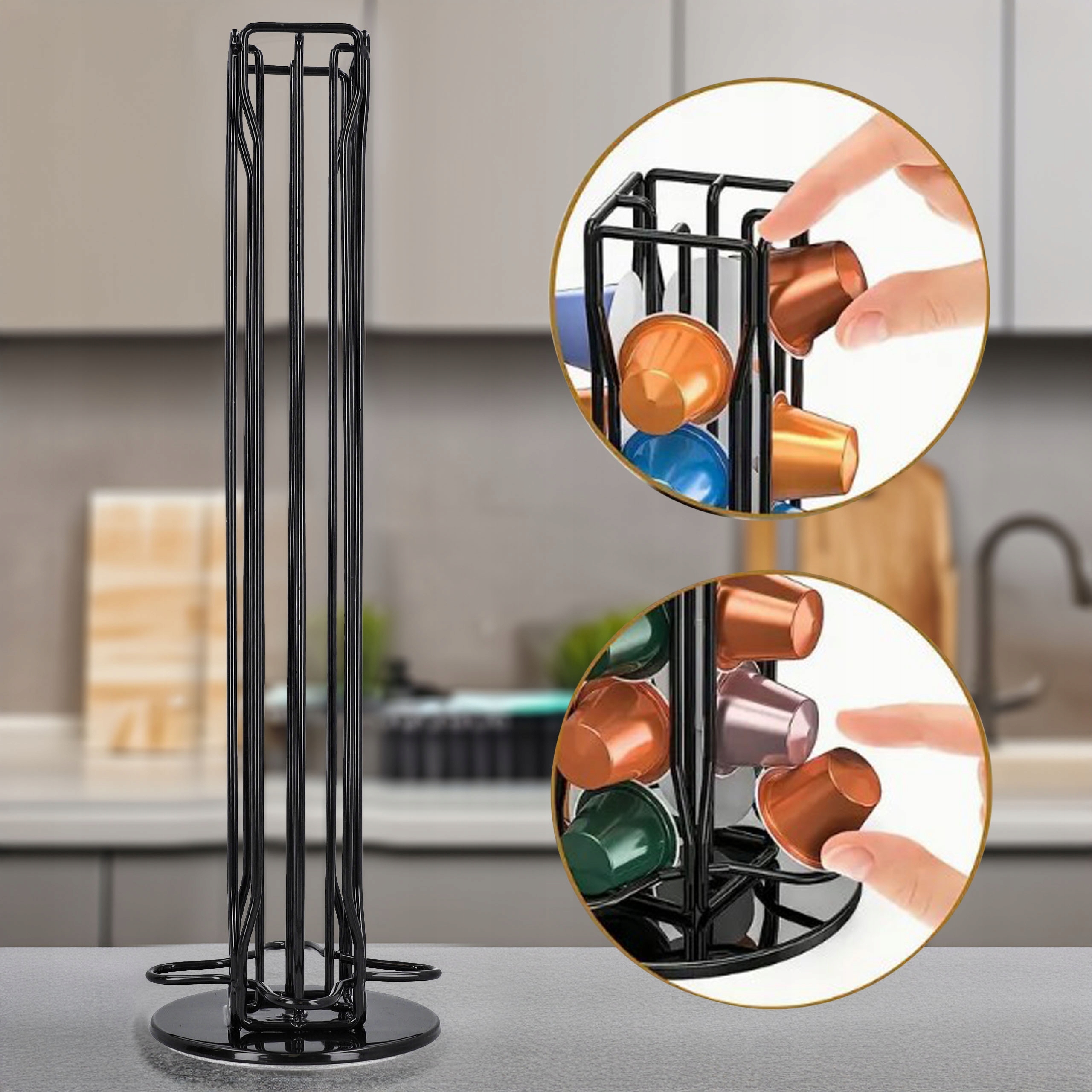 Завдяки можливості обертання на 360 градусів у вас є легкий доступ до кожної капсули. Стійка основа гарантує, що дозатор залишається на місці навіть після вибору останньої капсули.