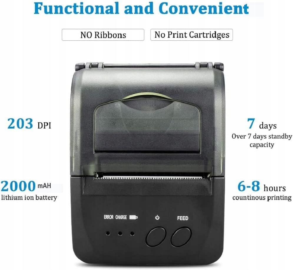 - Друк без обслуговування: принтер використовує термопапір, усуваючи потребу у використанні стрічок або чорнила.
