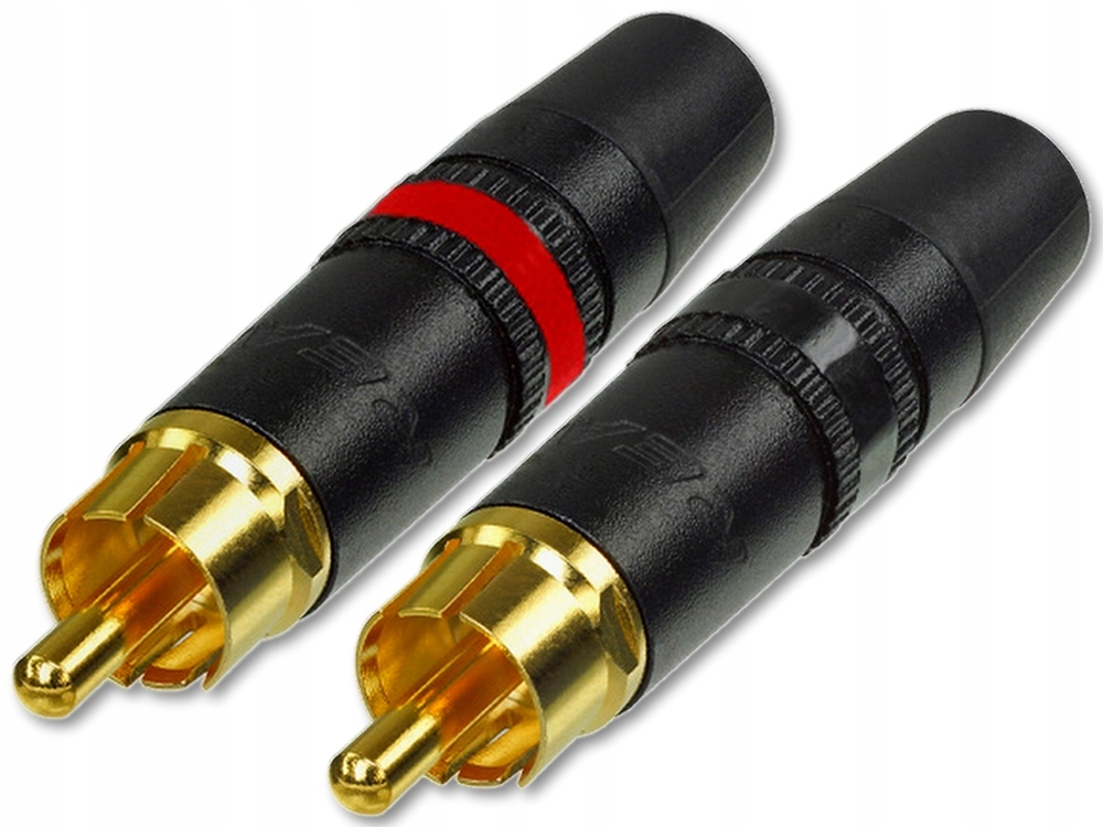 високоякісні роз'єми RCA від Rean. Вилки для встановлення кабелів, чорний корпус, контакти з золотом, гумова кришка анти -відгрупки, ручка для полегшення кабелю, кольоровий маркер, стереосистема.