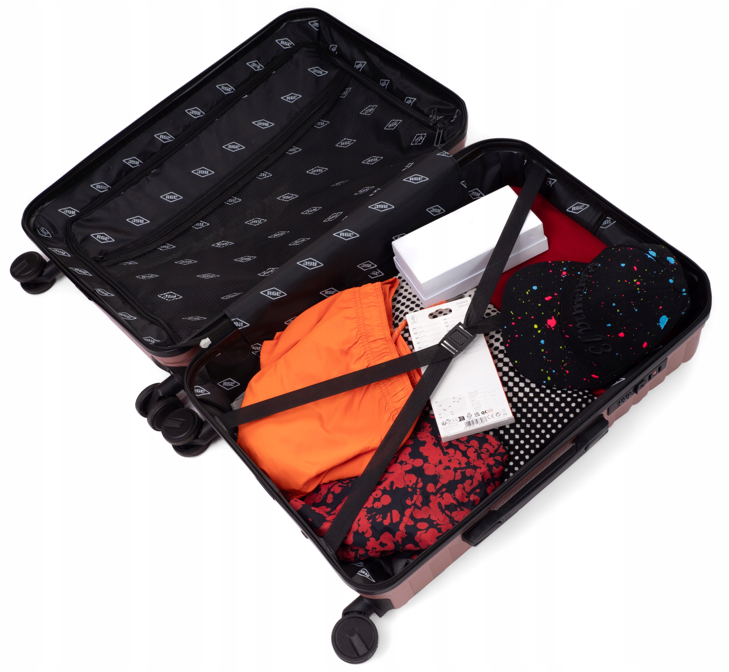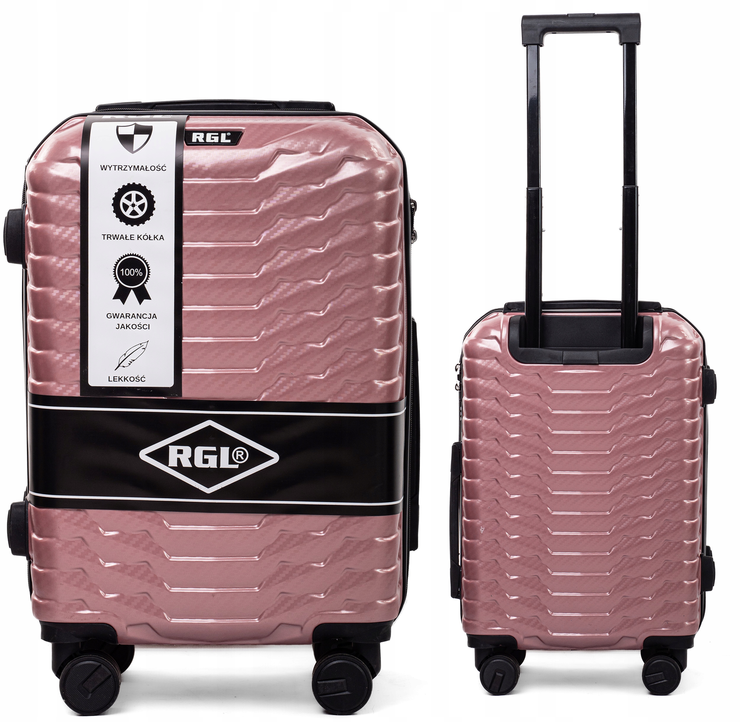- Суцільні валізи з колекції RGL. Створений з полікарбону. Валізи оснащені чотирма підшипниками колеса, висувною ручкою та двома гумовими ручками для полегшення багажу. Крім того, захист у вигляді блокування шифрів, що запобігає несприятливому доступу до доступу до внутрішніх приміщень. У великій та середній валізі дві ручки для перевезення багажу, в невеликій вгорі.
