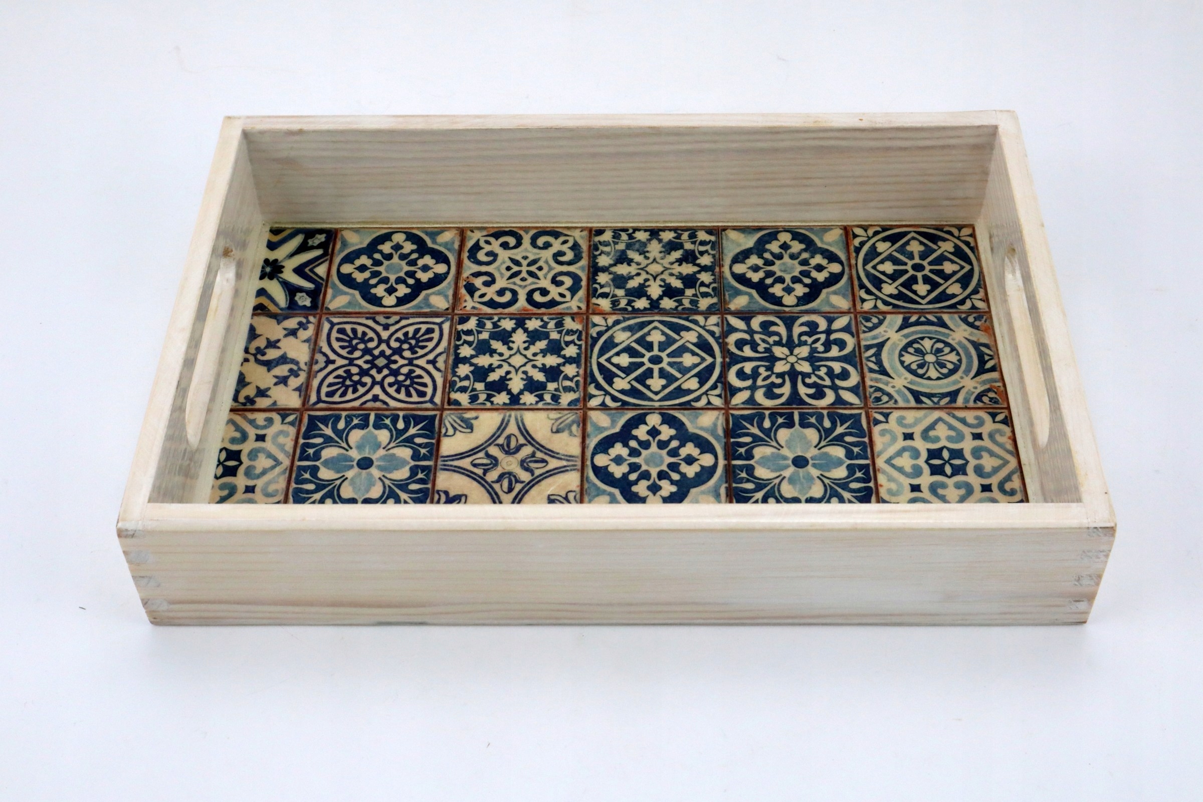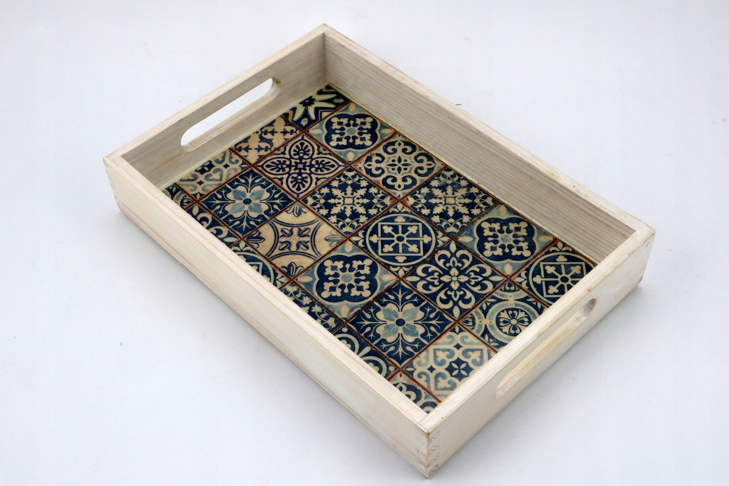 Невелика дерев'яна таця з ручками. Декоровано методом декупаж візерунком азулежуш у відтінках синього. Ручний розпис, вітражі, захист безбарвним лаком.