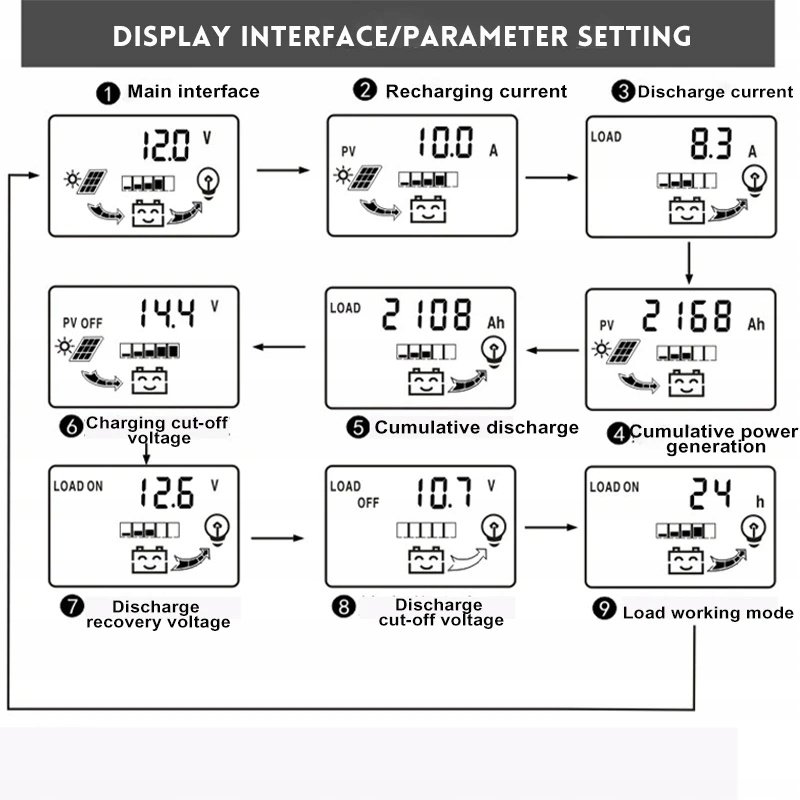 РК-ДИСПЛЕЙ: великий РК-екран струму заряджання та розряджання, запит сукупної генерації електроенергії та потужності розряду, відображення температури;