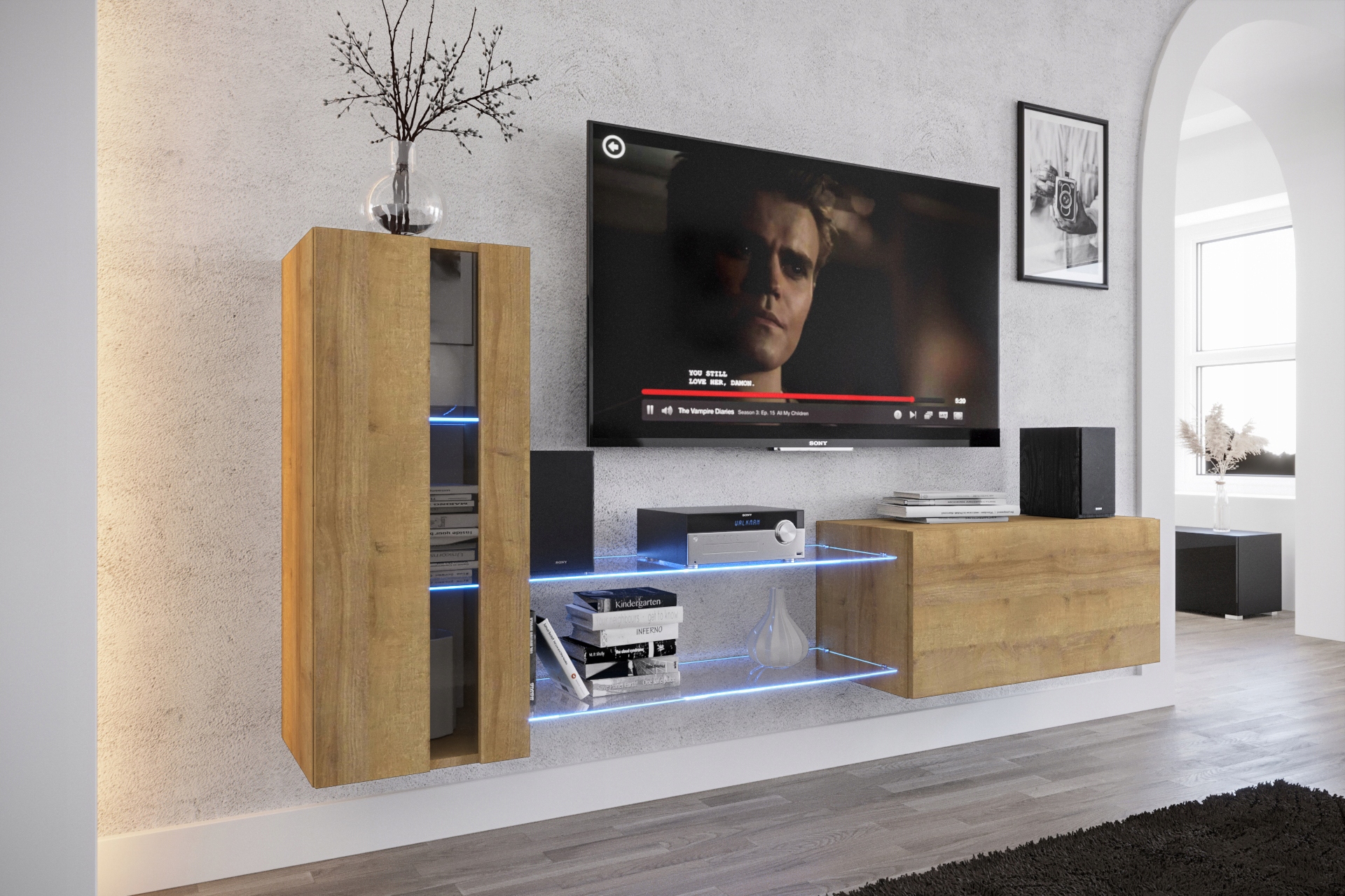 Стінка надзвичайно сучасна і водночас стримана, щоб легко оживити та прикрасити інтер’єр. Доступний у білому або чорному глянці, а також у тонких відтінках дуба сонома та золотого дуба, тобто кольорів, які є авангардом останніх тенденцій дизайну.