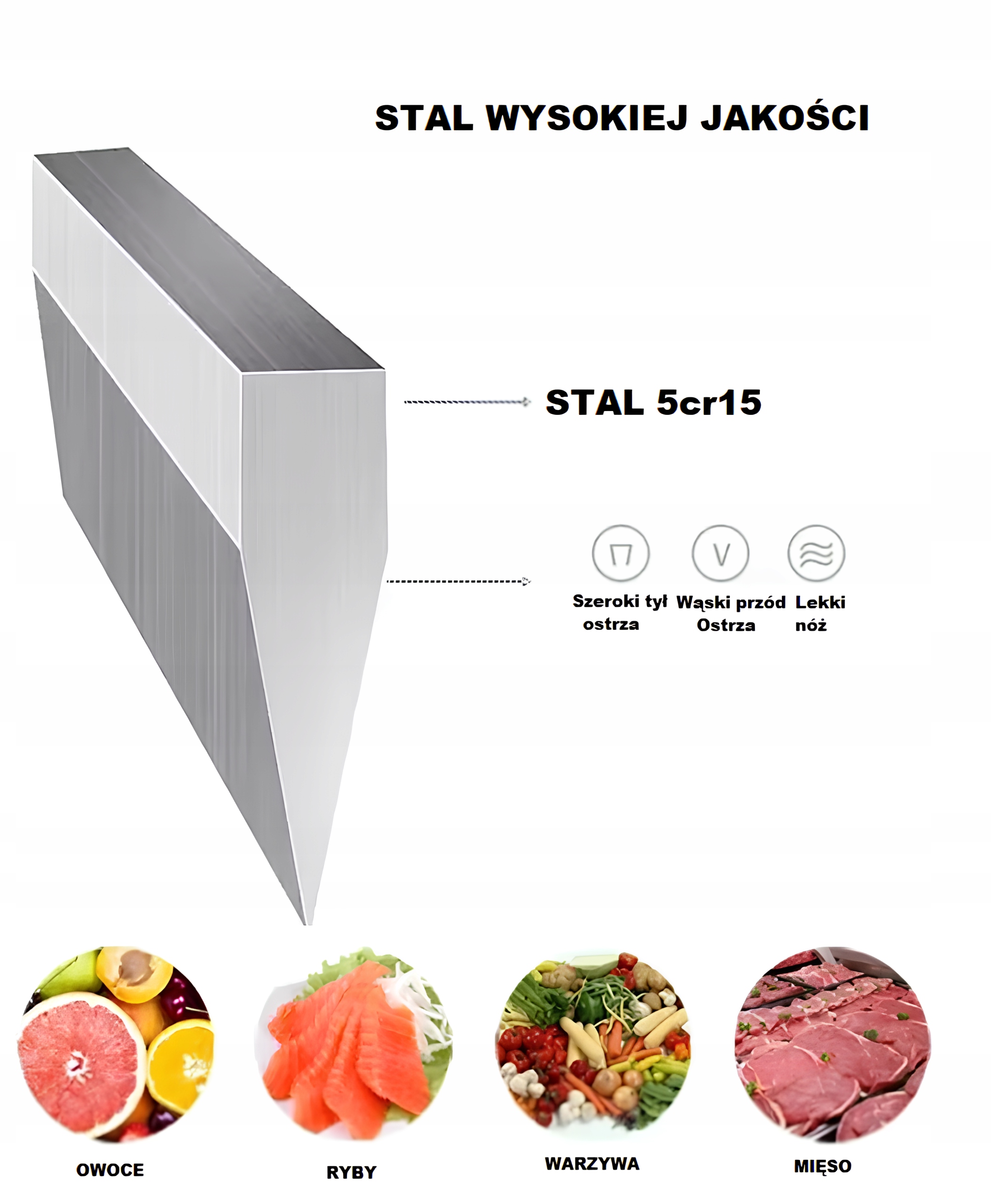 Лезо ніж було виготовлено з високої якості нержавіючої сталі 5CR15. Крім того, його дизайн сприяє легкому різання продукції. Завдяки широкій спині лезо міцне, а звужена передня частина змушує ножа бути гострим.