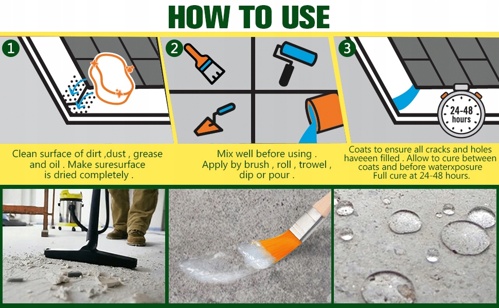 [Високоефективна гідроізоляція, результати] - Цей продукт працює з ефективними гідроізоляційними продуктами та є чудовим рішенням для ремонту протікання стін, ремонту протікання даху, гідроізоляції туалету та підвіконь. Після розміщення контейнер складається через 24-48 годин, коли він може стати міцнішим.