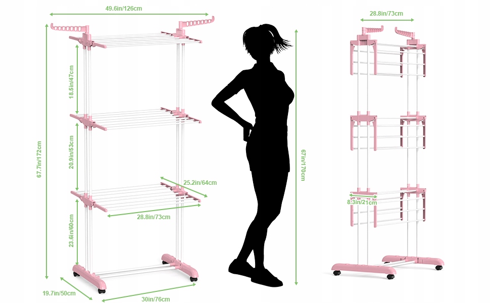 - 4-поверхова мобільна сушарка для одягу з колесами-спасибі до 4 колеса, можна легко і зручно переміщувати та розміщувати в різних місцях. 4-поверхова вежа сушарки для одягу збільшує простір для зберігання або сушіння, складається з 6 складних шарів сушіння та 2 регульованих бічних крил, а ширина сушіння полиці становить лише 21 см після складання, що зберігає місце.