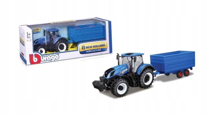 Модель NEW HOLLAND T7.315 з причепом і тюками соломи (18-44067) з колекції Bburago в масштабі 1:32. Модель виготовлена з металу, з пластиковими аксесуарами. Довжина трактора приблизно 16 см. довжина всього набору приблизно 32 см. Розміри упаковки: 36,5 х 11 см.