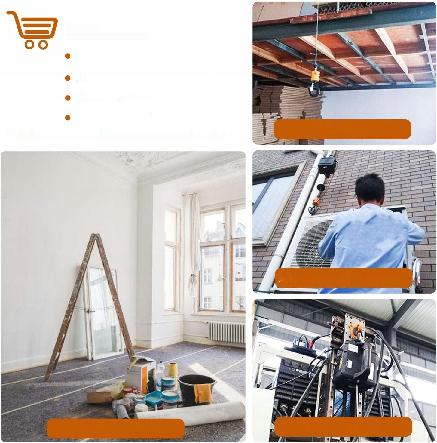 Верхні та нижні гачки можуть обертати 360 °, а спеціальний захист запобігає падінню. Суцільну, оцинковану сталеву мотузку важко зламати, а автоматичне вимикання, коли досягнення положення межі захищає пристрій від перевантаження.