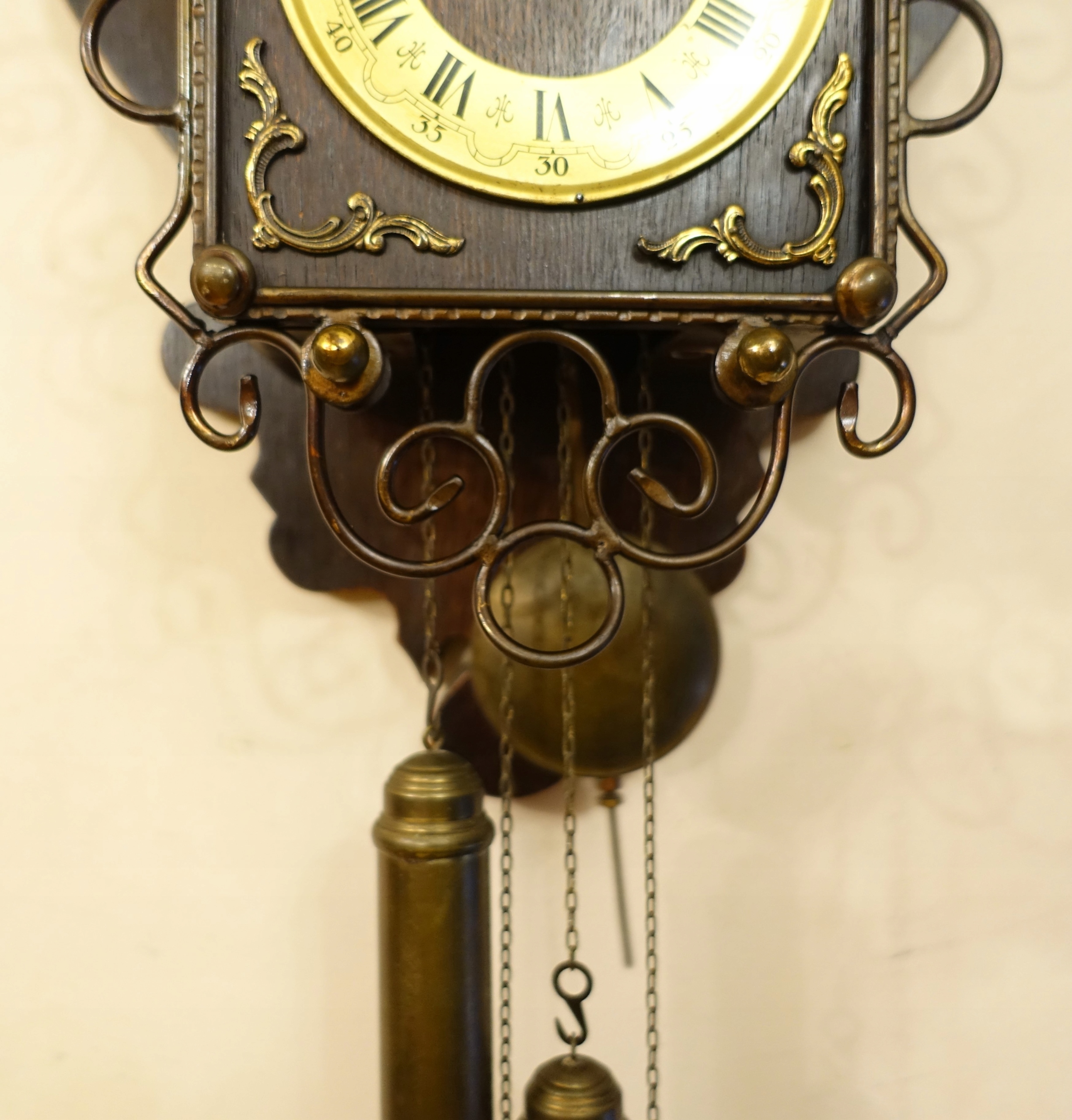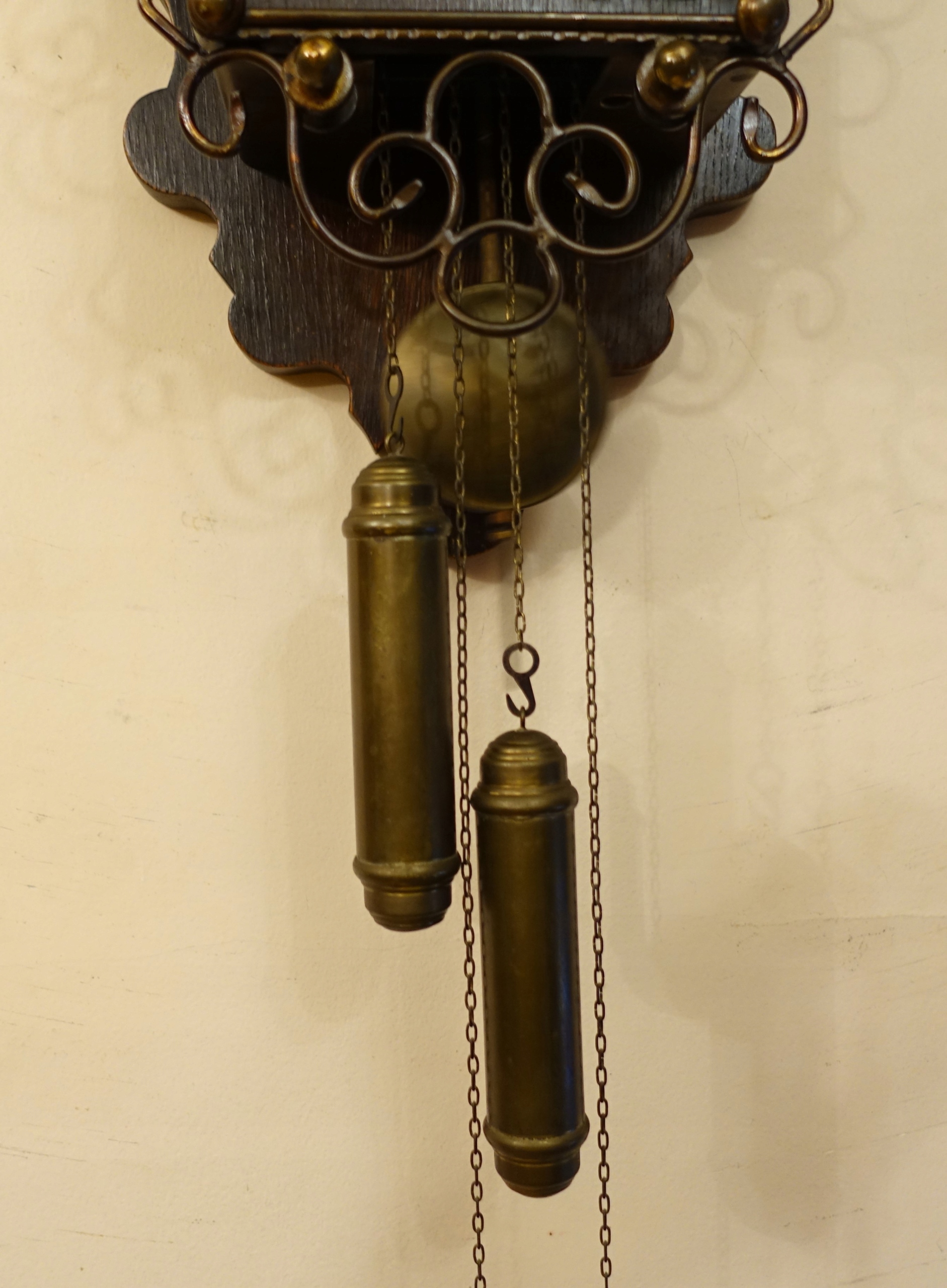 Механізм годинника, керований маятниковими та латунними вагами, підвішений у нижній частині до ланцюга