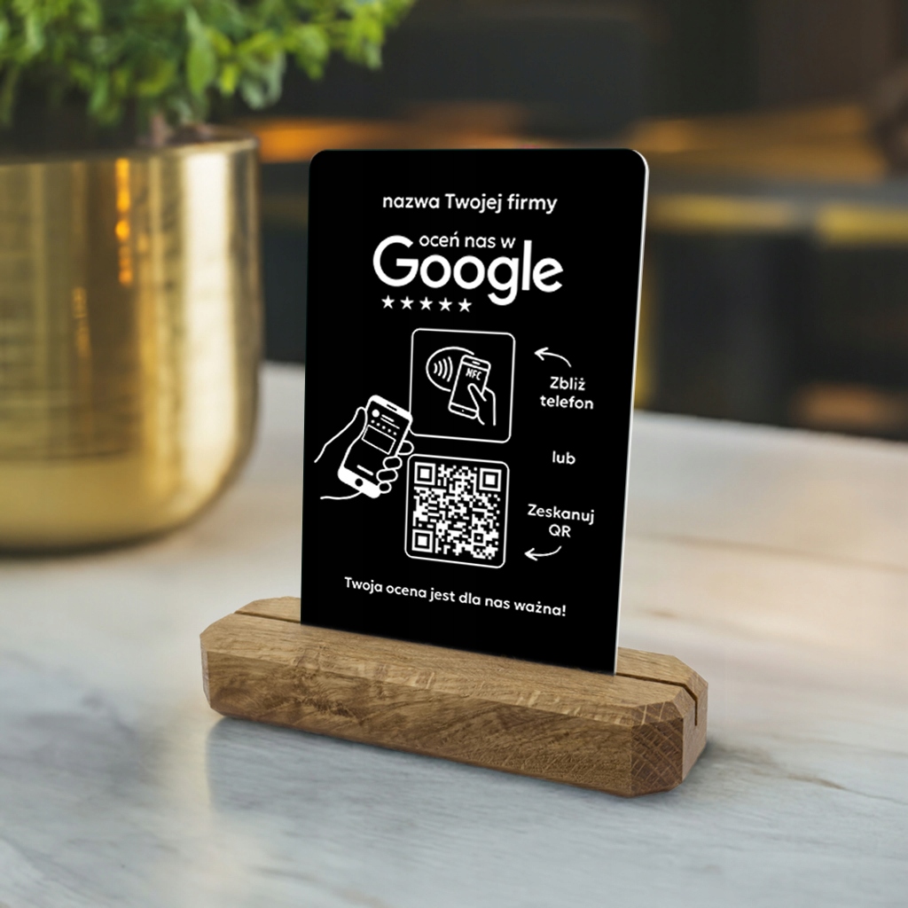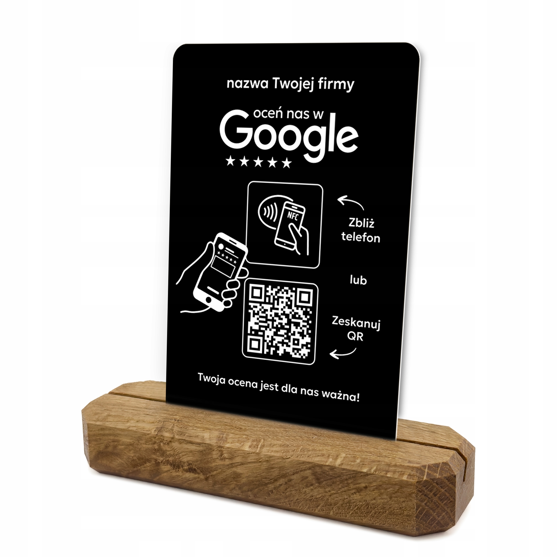 Стаді з тегом NFC та QR -кодом, карткою, столом, планшетом, ведучим для збору думок у Google, оцінюйте нас + персоналізацію з назвою вашої компанії.