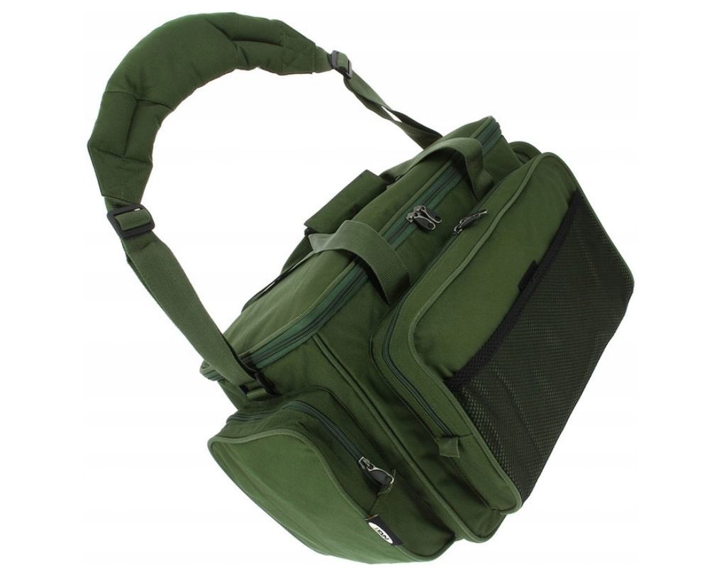Велика сумка з ізольованим основним відділенням, покритим прогумованим матеріалом для легкого чищення. Сумка виготовлена з водонепроникного, міцного нейлону 600D оливкового кольору. Закривається на щільний замок, який також захищає вміст від комах і пилу. Має регульований плечовий ремінь і зручну ручку. Передня частина має кишеню на блискавці та кишеню-сітку. Дві кишені на блискавці з боків.