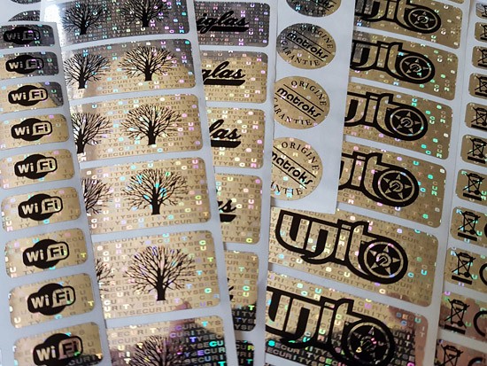 Після лущення на етикетці з’являються недійсні субтитри. Голограми також залишають написи на захищеному елементі. Фольга проводить електроенергію, тому вона не підходить для використання на друкованих схемах та електронних елементах. Він стійкий до атмосферних та хімічних факторів. Він ідеально підходить для склеювання на плоских і злегка вигнутих поверхнях та на суглобах різних елементів. Забруднені поверхні повинні бути очищені та знежирені перед тим, як приклеїти печатку. Повне затвердіння клею та повна функціональність відбувається протягом 24 годин. від склеювання етикетки.