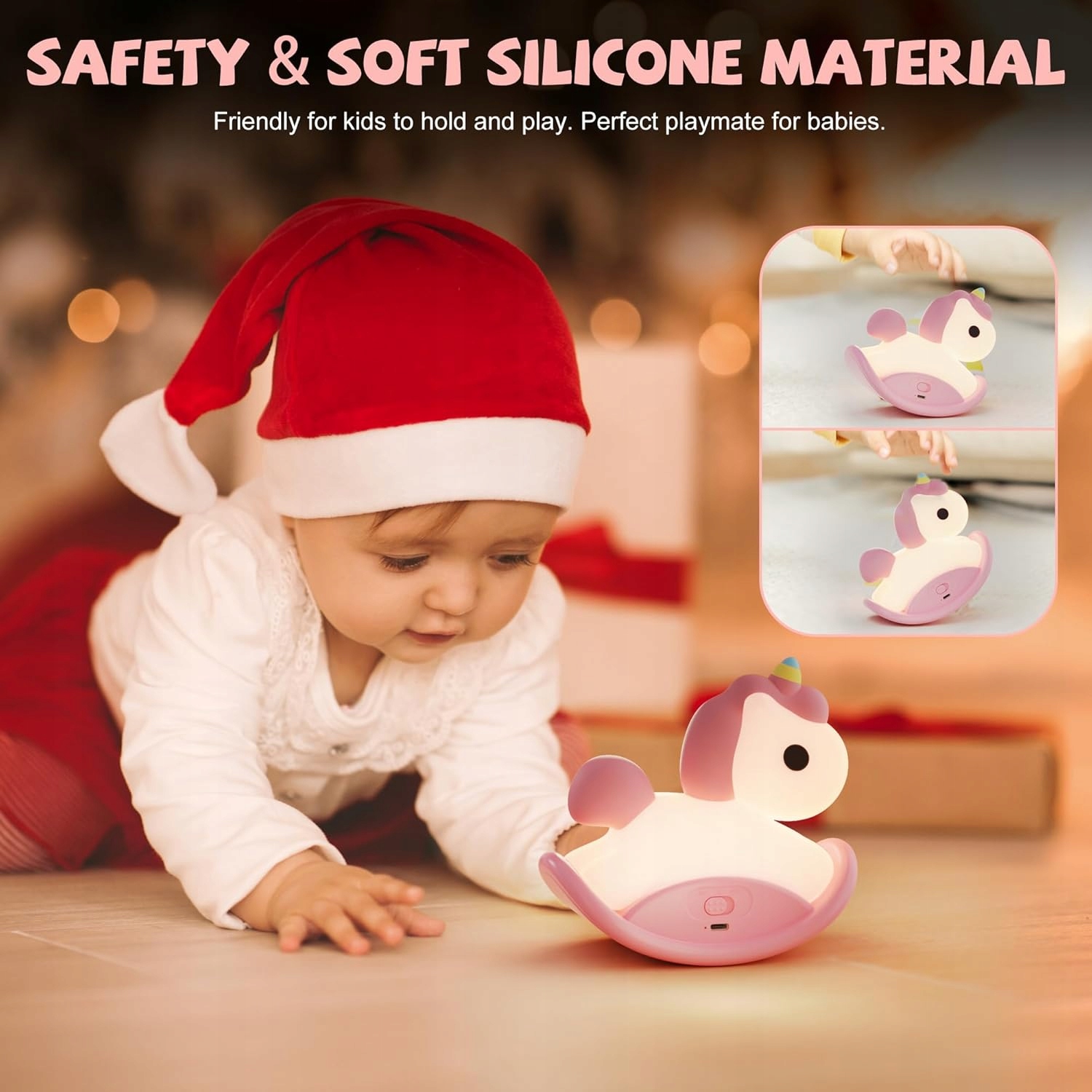 - Дитяча безпека та доброзичлива: Нічна лампа з єдинорогом виготовлена з м'якого силікону, тому немає ризику ковтати невеликих деталей або потрапити на його поверхню. Його можна торкнутися і натиснути, щоб встановити яскравість. М’яке, не заряджене світло створює тепле і затишне оточення, а затемнена лампа ліжка компактна і портативна.