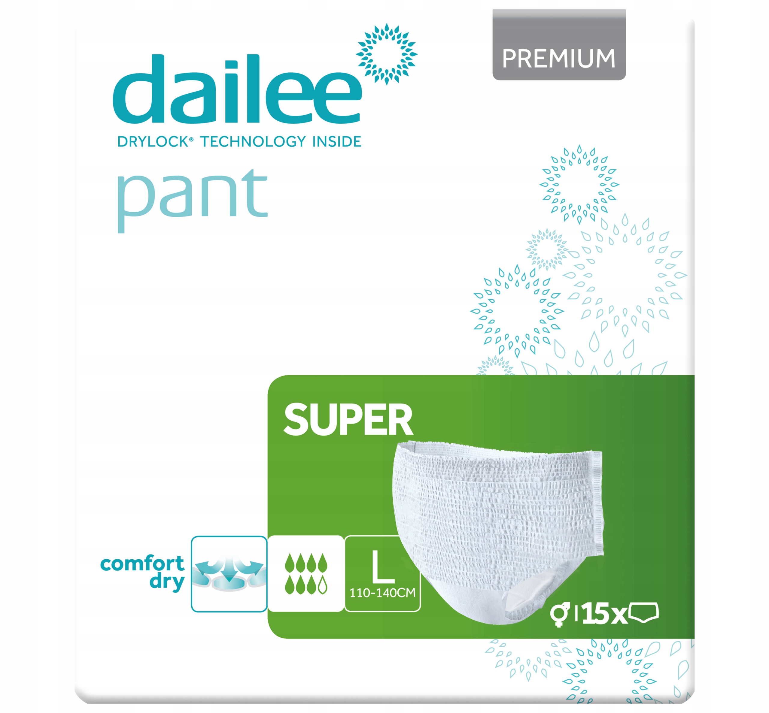 Dailee Pant Premium Super — це натягуючі поглинаючі трусики від бельгійського виробника, призначені для дорослих з важким нетриманням сечі. Поглинаюча здатність цих трусиків становить 7/8 крапель.