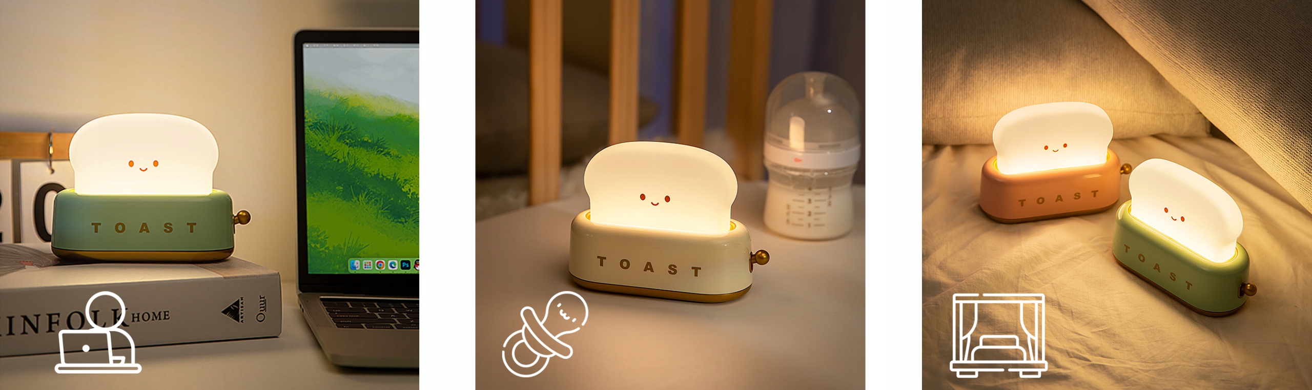 Нічну лампу Mr. Toaster можна використовувати як настільну лампу або кімнатну атмосферну лампу, яка природно поєднується з вашими меблями і прикраси. Легкий дизайн із можливістю перезаряджання дозволяє використовувати його де завгодно, наприклад у спальні, вітальні, їдальні, кухні, кав’ярні, у кемпінгу та як прикрасу освітлення.