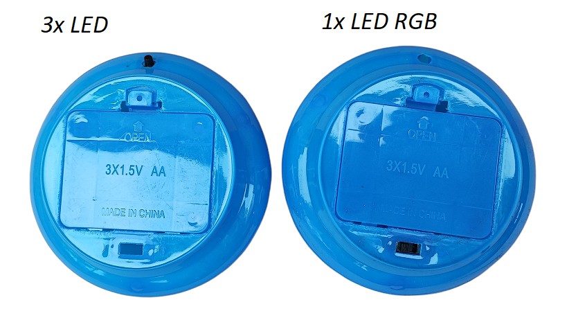 Діоди випромінюють червоне, синє та зелене світло. Світлодіодна лампа живиться від 3 батарейок АА (не входять в комплект).