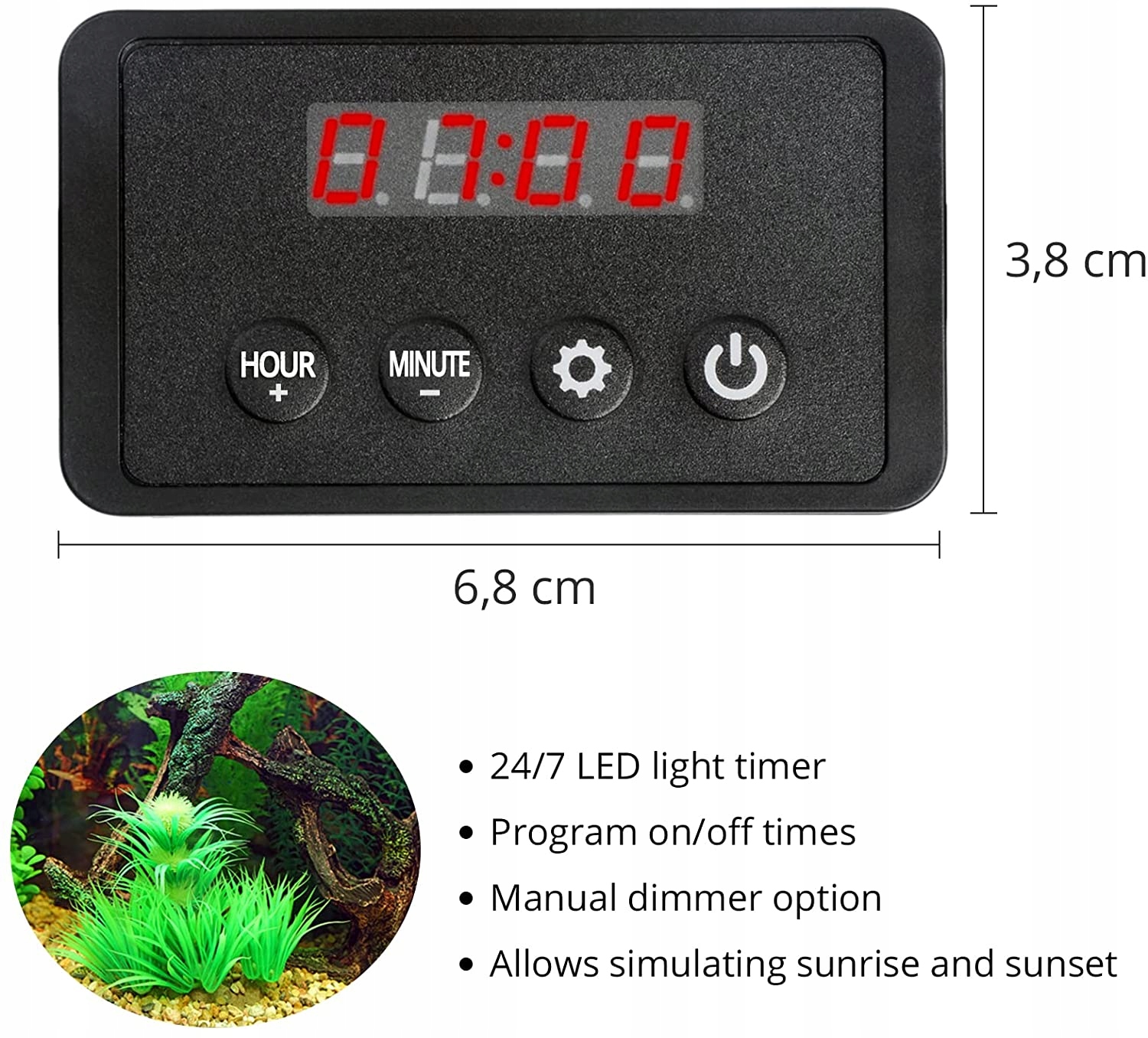 - Програмований таймер освітлення до 24 годин для риб, імітує схід і захід сонця, щоб зменшити стрес для акваріумних риб.