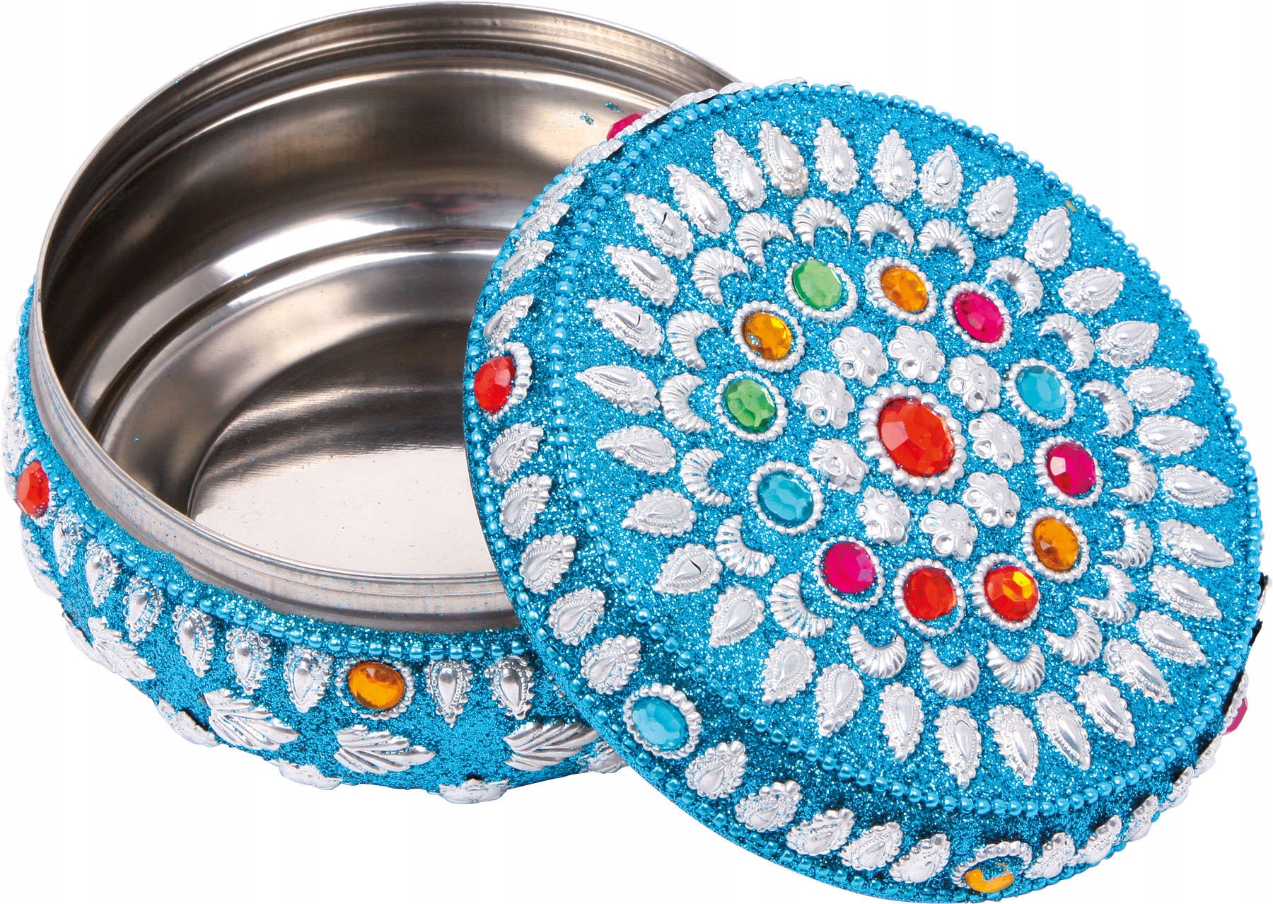 Шкатулка виготовлена з металу. Кришка і коробка прикрашені синіми блискітками, деталізованими емблемами і різнокольоровими кристалами. Підійде для зберігання прикрас або як прикраса кімнати.