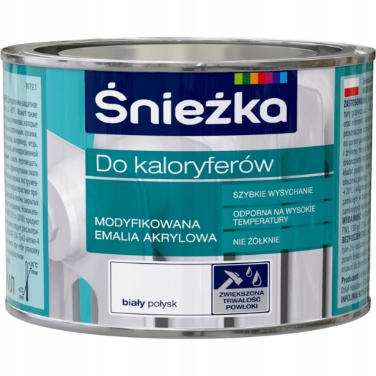 Модифікована акрилова емаль для радіаторів Śnieżka, завдяки своїм чудовим властивостям: стійкість до підвищених температур, відсутність пожовтіння та відмінне зчеплення з поверхнею, призначена в основному для декоративного та захисного фарбування радіаторів та елементів установки центрального опалення. Його також можна використовувати для фарбування попередньо загрунтованих дерев’яних і дерев’яних елементів, сталі, чавуну, штукатурки, бетонних основ, гіпсокартонних плит і відновлення старих олійно-фталевих фарб всередині приміщень.