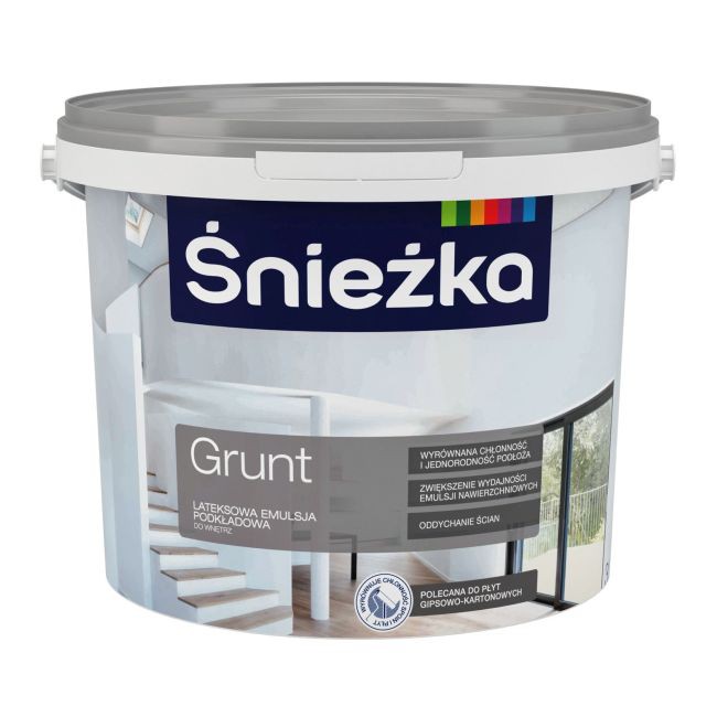 Śnieżka Ґрунтовка, завдяки спеціальним добавкам, наноситься товстим шаром і усуває відмінності у фактурі та кольорі основи. Проникає в основу, покращуючи адгезію фінішного шару і зменшуючи його витрату. Використання Śnieżka Grunt суттєво здешевлює фарбування, оскільки для досягнення очікуваного ефекту зазвичай достатньо одного шару ґрунтовки та одного фінішного. Особливо рекомендується для першого фарбування гіпсокартонних плит і поверхонь з неоднорідною текстурою. Ідеально покриває цементні, цементно-вапняні розчини, деревину та матеріали на її основі в житлових, громадських і промислових приміщеннях. Призначений для фарбування всередині приміщень.
