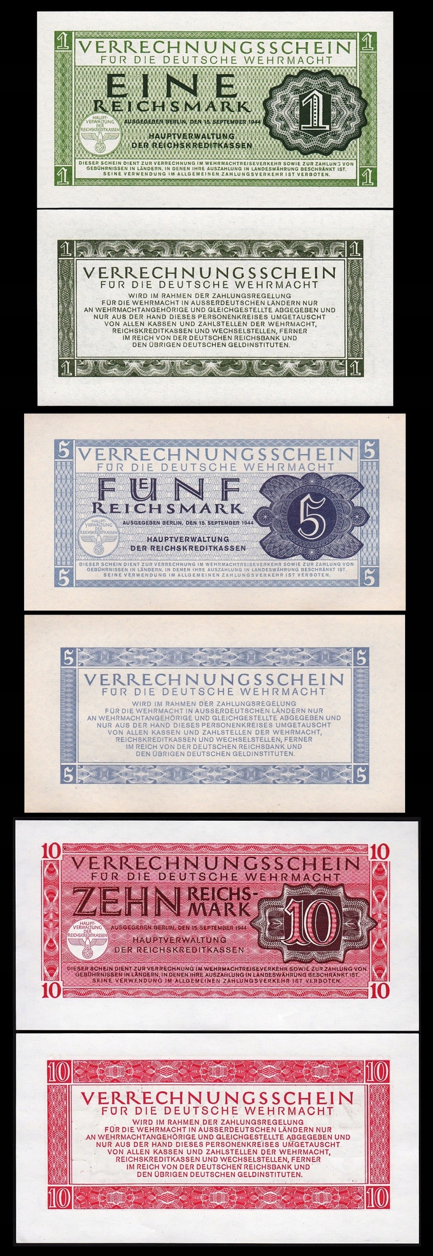 NIEMCY ZESTAW 1 + 5 + 10 Reichsmark 1944 P-M38-39-40 WEHRMACHT UNC