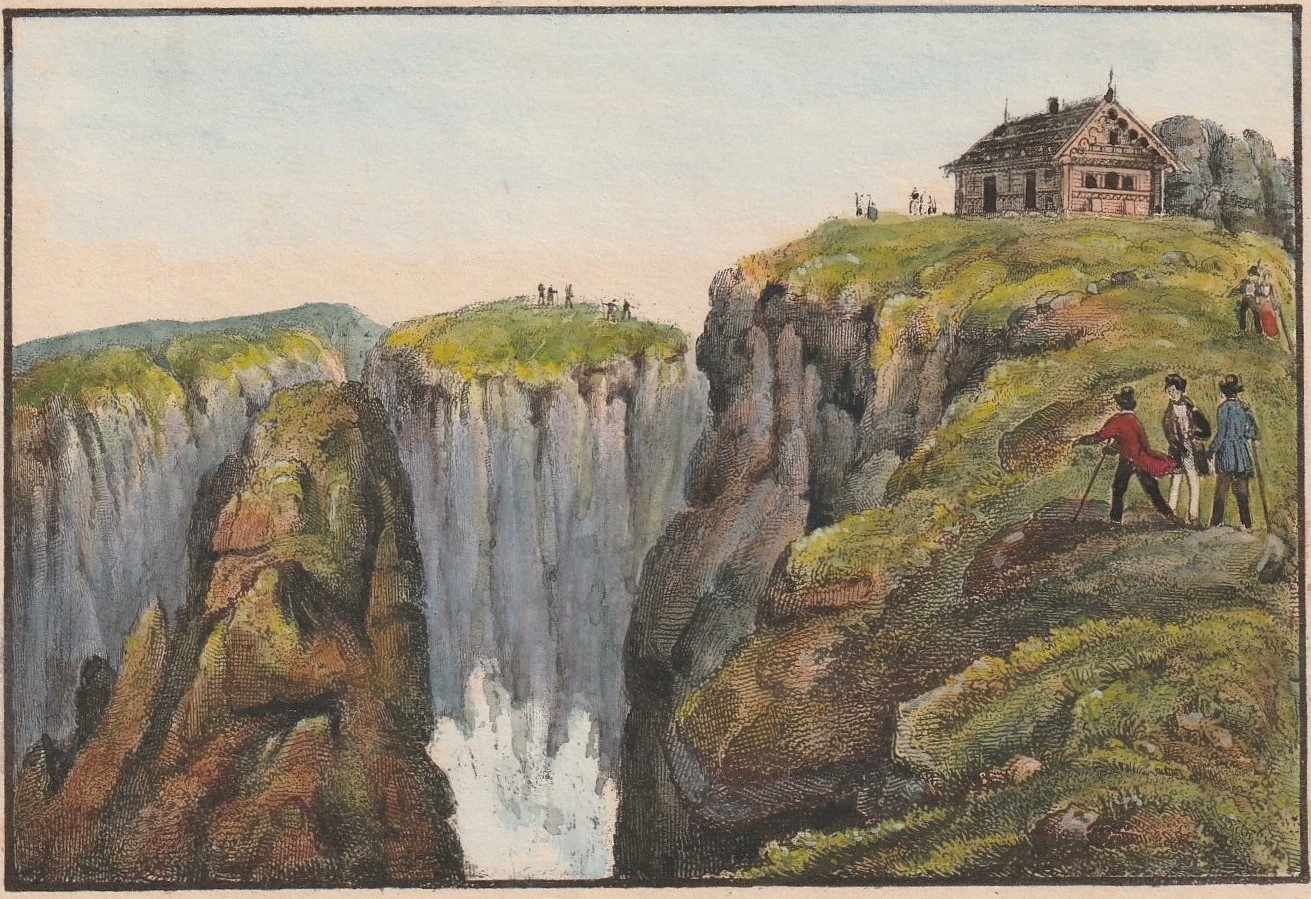 ŚNIEŻNE KOŁÓŁ (KARKONOSZE). Притулок, Е. В. Кніппель, Ковари близько 1840 р., кольорова літографія, без підпису; на звороті опис олівцем; розміри графіки: прибл. 110x73 мм, розмір аркуша: бл. 180х150 мм.