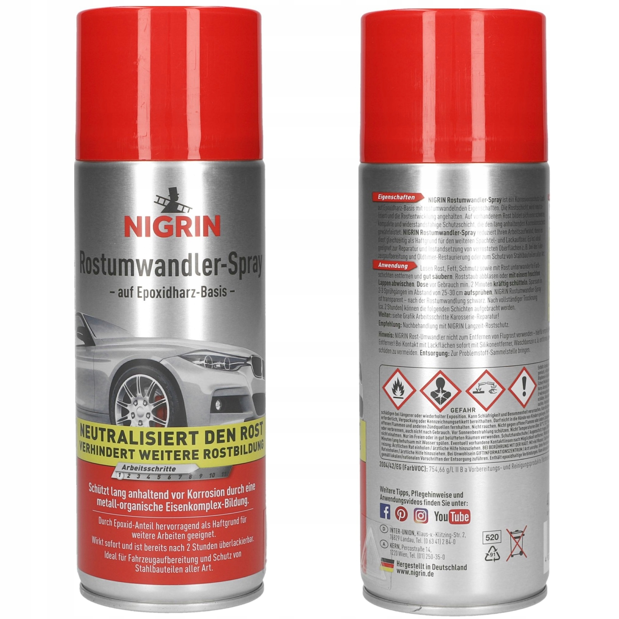 NIGRIN converter spray – епоксидна антикорозійна фарба з антикорозійними властивостями. Продукт можна використовувати як основу для подальшого нанесення шпаклівки та лаку.