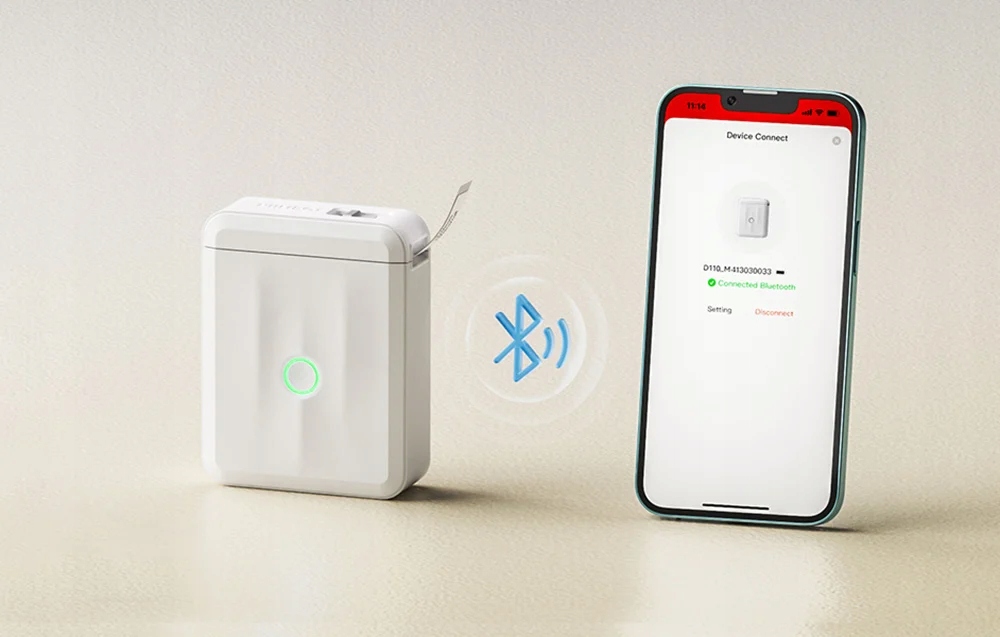 Принтер Niimbot D110M підключається до смартфонів за допомогою Bluetooth, що дозволяє швидко та просте з'єднання з різними пристроями. Додаток Niimbot, доступний у App Store та Google Play, дозволяє легко розробляти та редагувати етикетки безпосередньо з телефону. Інтуїтивний інтерфейс додатків робить створення мітків легким та приємним, а синхронізація з хмарою дозволяє зберігати та отримувати доступ до проектів з різних пристроїв.