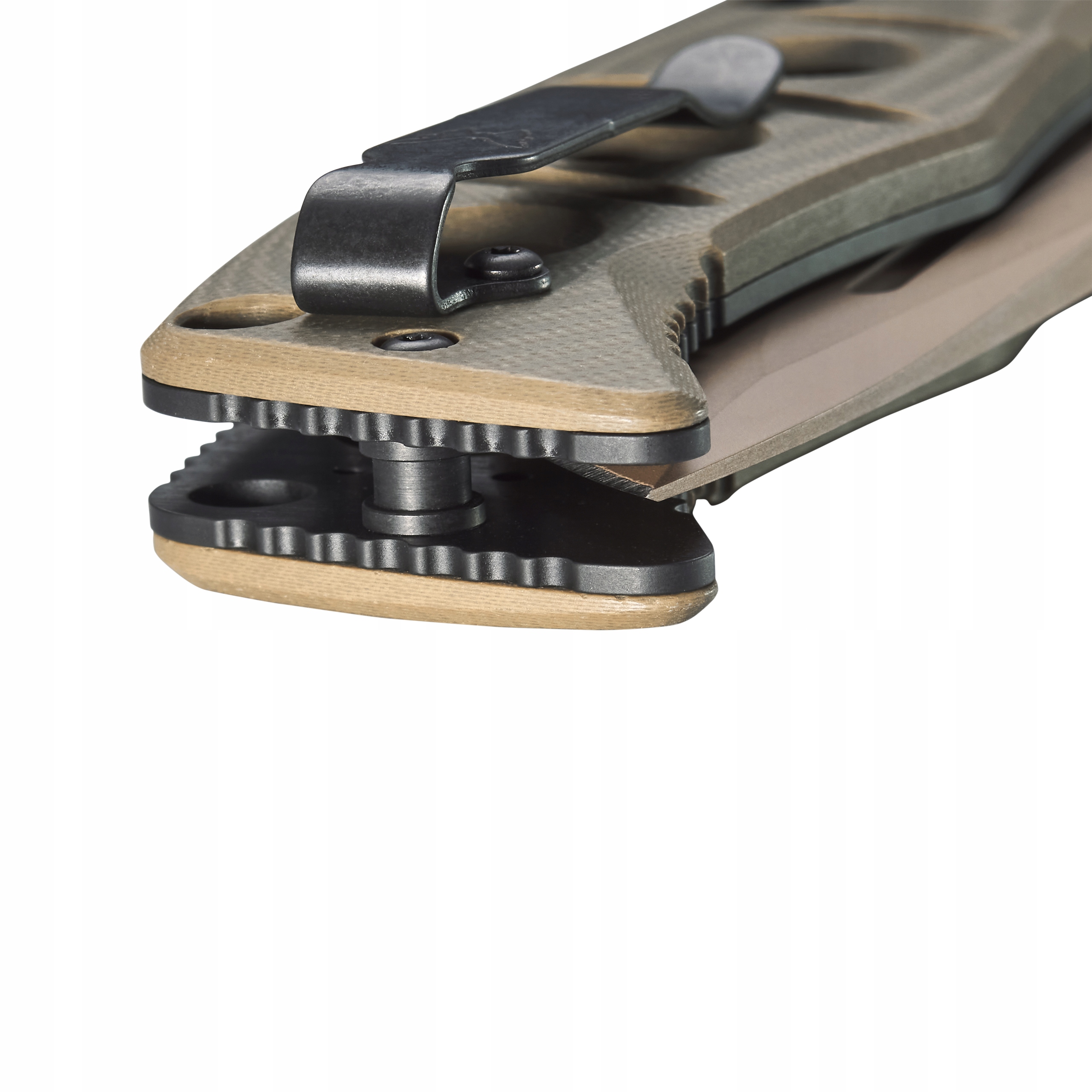 Лезо можна зручно та швидко розкласти однією рукою за допомогою двостороннього фіксатора, тому ніж готовий до використання в одну мить. За безпеку роботи відповідає механізм Auto Axis-lock, який цінується за високу механічну міцність, стійкість до забруднень і простоту використання. Ніж має додатковий замок, який захищає від випадкового розгортання леза під час носіння.