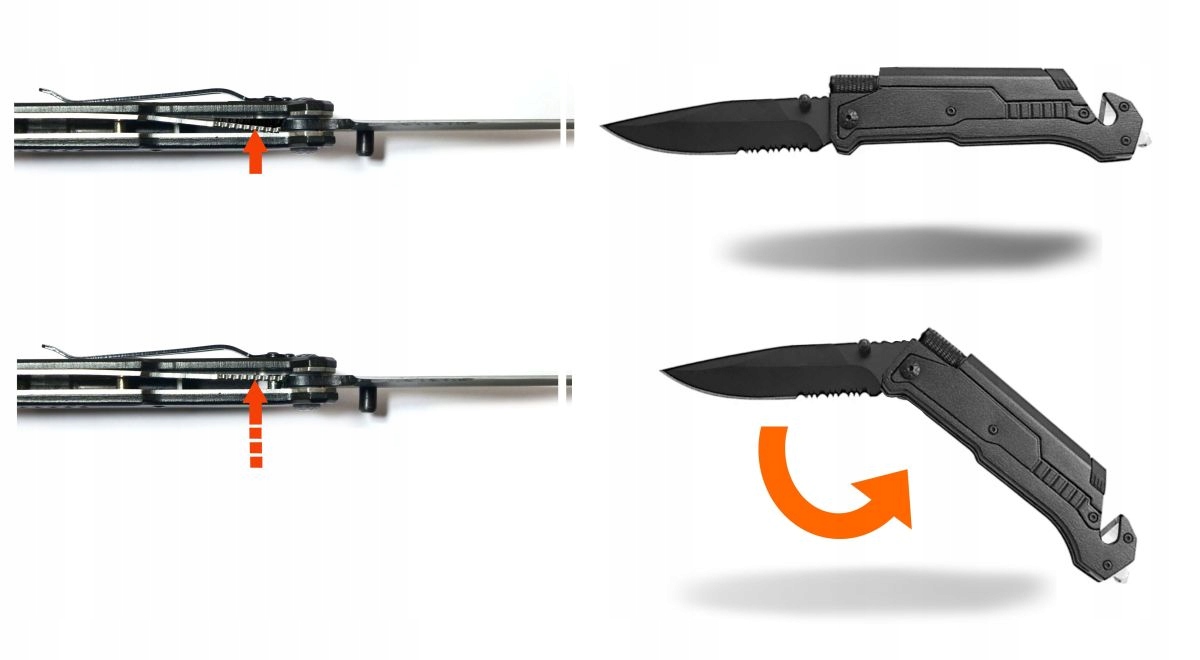 - 2. Блокування леза повне відкриття леза автоматично блокує його (підтверджується характерним клацанням) замок вкладиша, на фото ми показали, як розблокувати/скласти ніж (будьте дуже обережні, роблячи це отже, завдяки лезу ) .