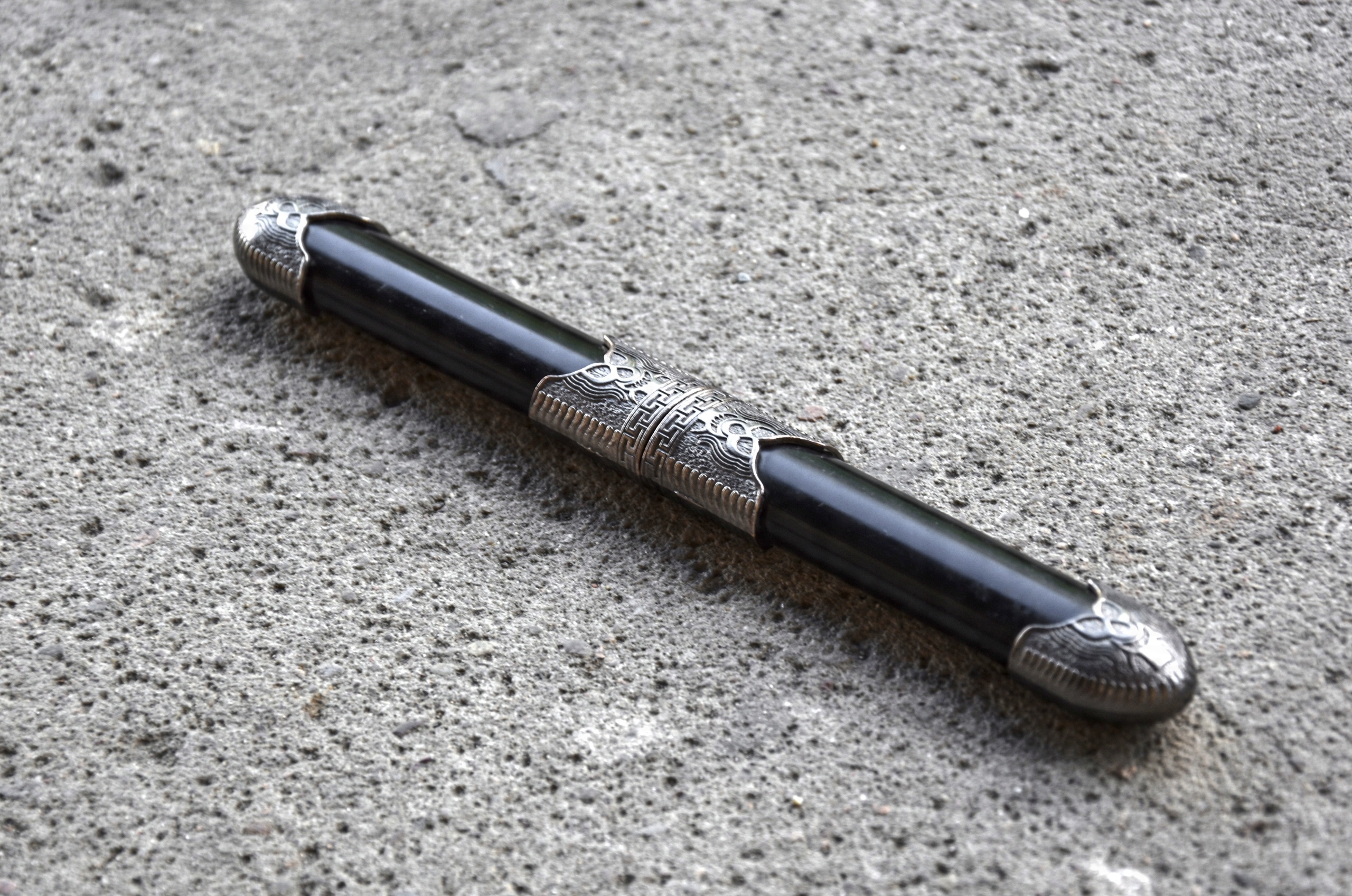- Набір містить два кинджали в античному стилі з різьбленням черепа та ножі з двосічним лезом, які ховаються один навпроти одного в одній піхві.