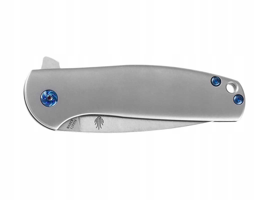 Витончені накладки з матового титану 6AL4V відрізняються досконалістю і точністю обробки. Поверхні та краї ручки були відполіровані та м’яко профільовані для забезпечення максимально зручного захоплення. Високу якість і унікальний характер ножа підкреслюють сині анодовані гвинти і плоска титанова кліпса. Отвір на задній частині рукоятки дозволяє вставити паракордову оплетку або шнурок.
