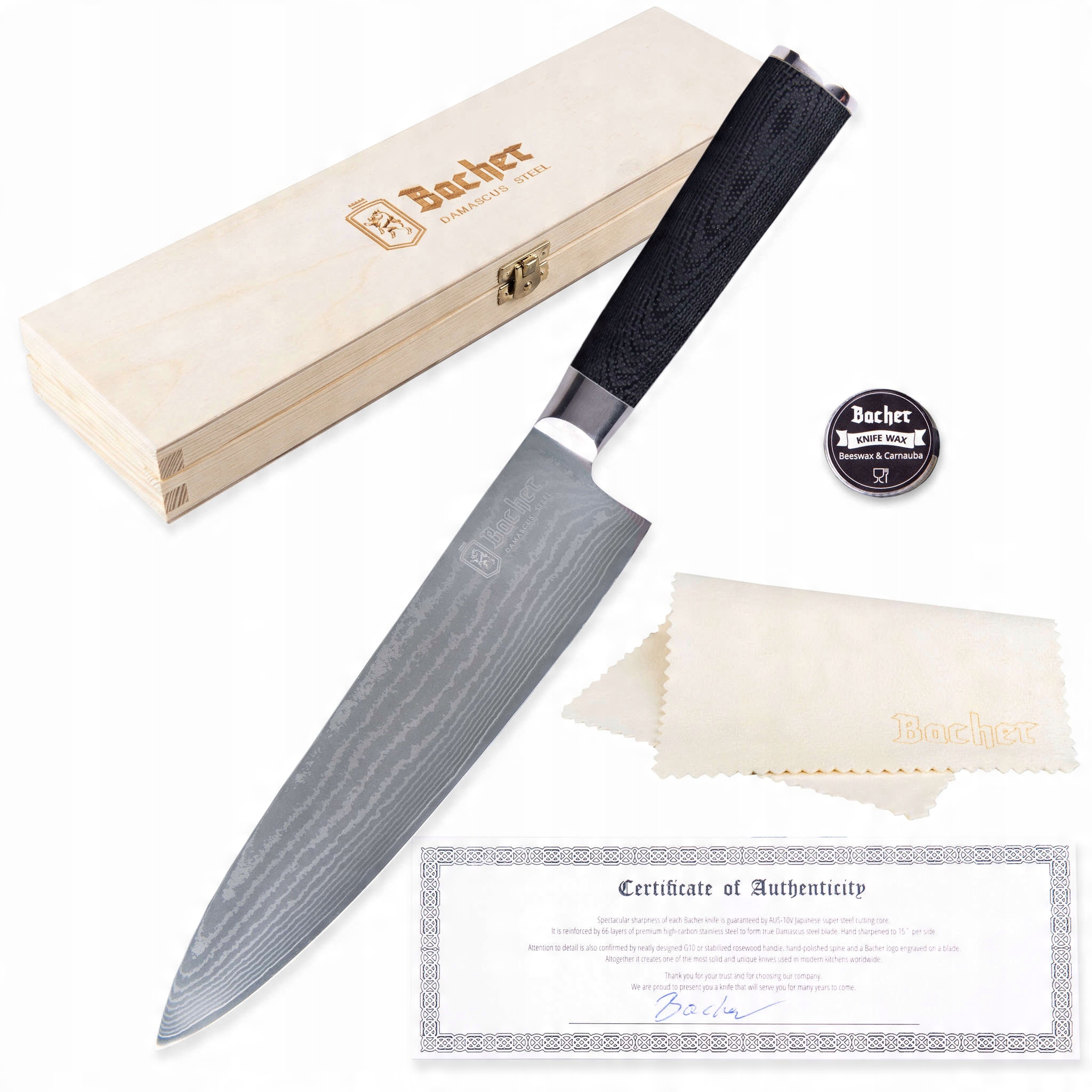 Ніж шеф-кухарський BACHER з японської дамаської сталі AUS-10V - подарунковий набір в дерев'яній коробці - чорний