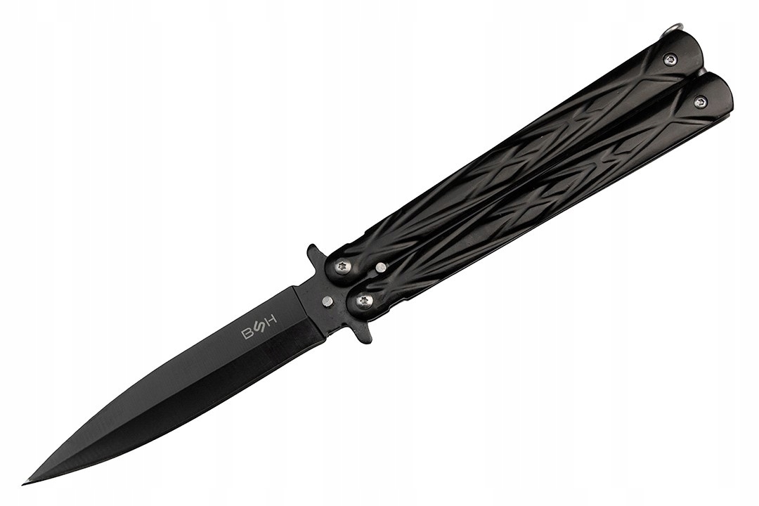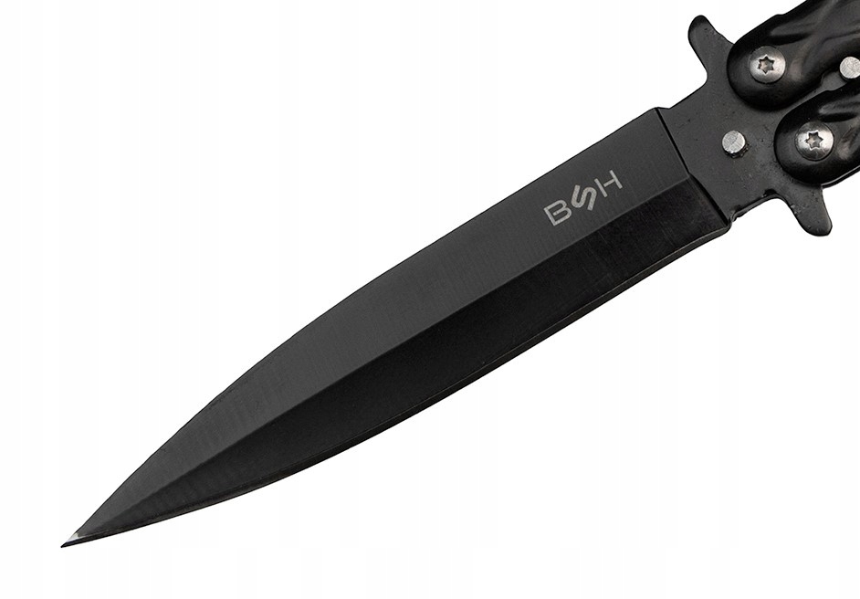 ✔️Чорний ніж-метелик має стандартну ручку, що складається з двох металевих частин, які захищають лезо в закритому стані.