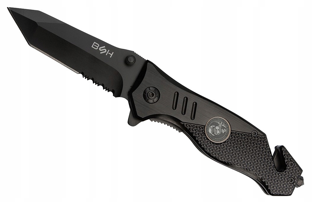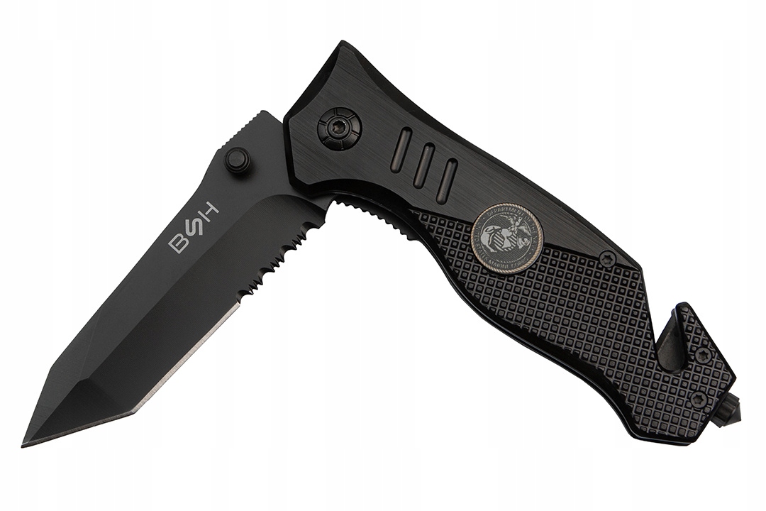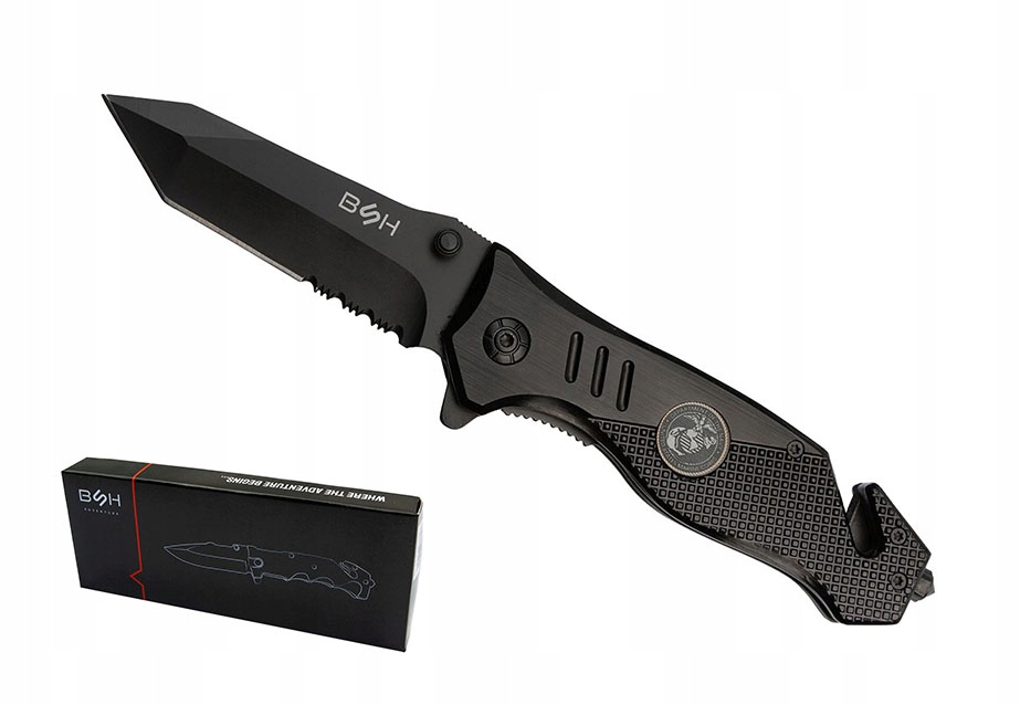 Середнього розміру, надійний рятувальний ніж, оснащений необхідними елементами, такими як: розбивач скла та лезо безпечного пояса .
